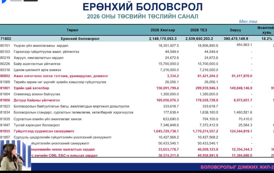 Уг хэлэлцүүлгийн үеэр Боловсролын Яамны Санхүү, хөрөнгө оруулалтын газрын дарга н.Должинсүрэн Боловсролын салбарын 2026 оны төсвийн төслийг танилцууллаа.