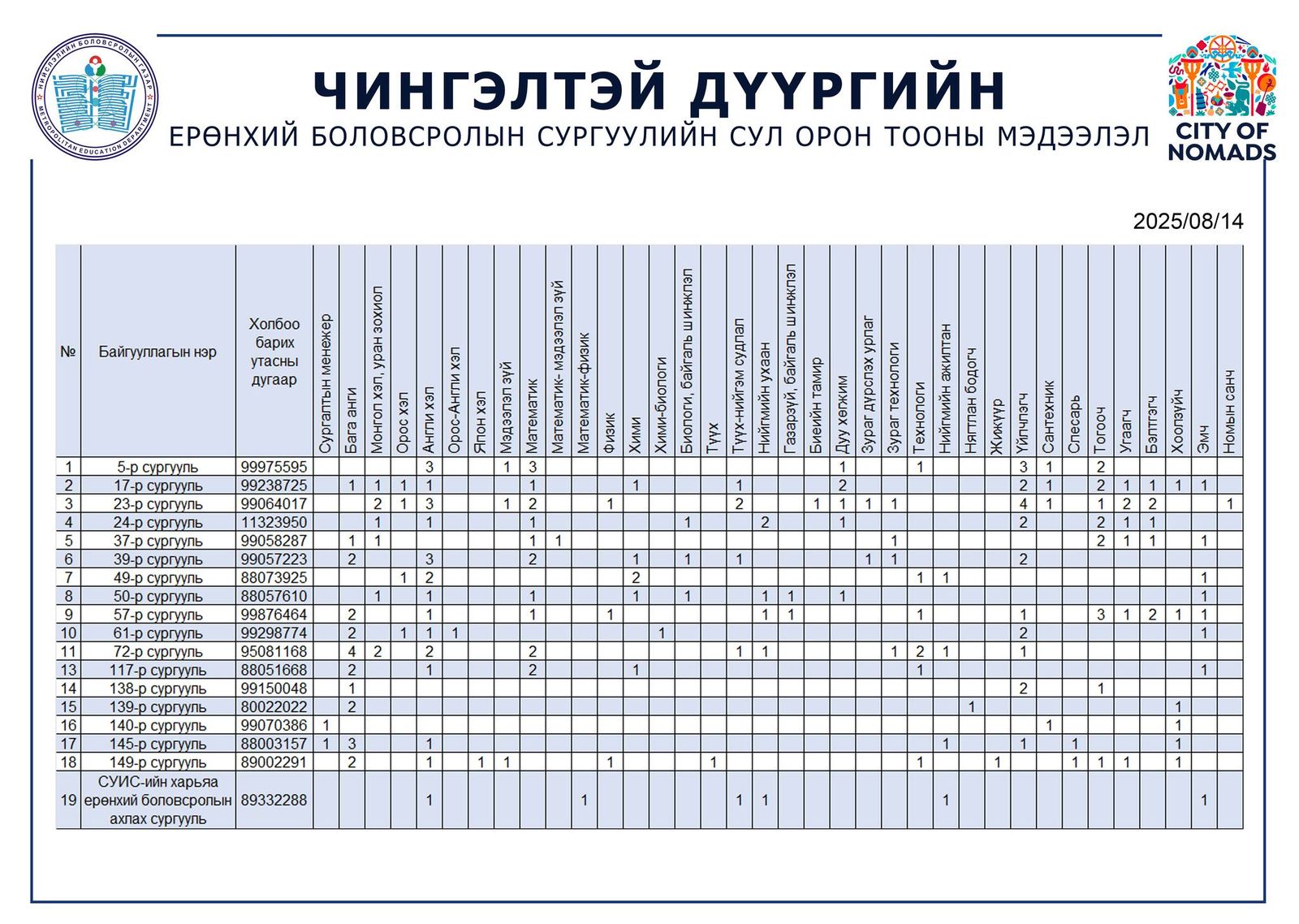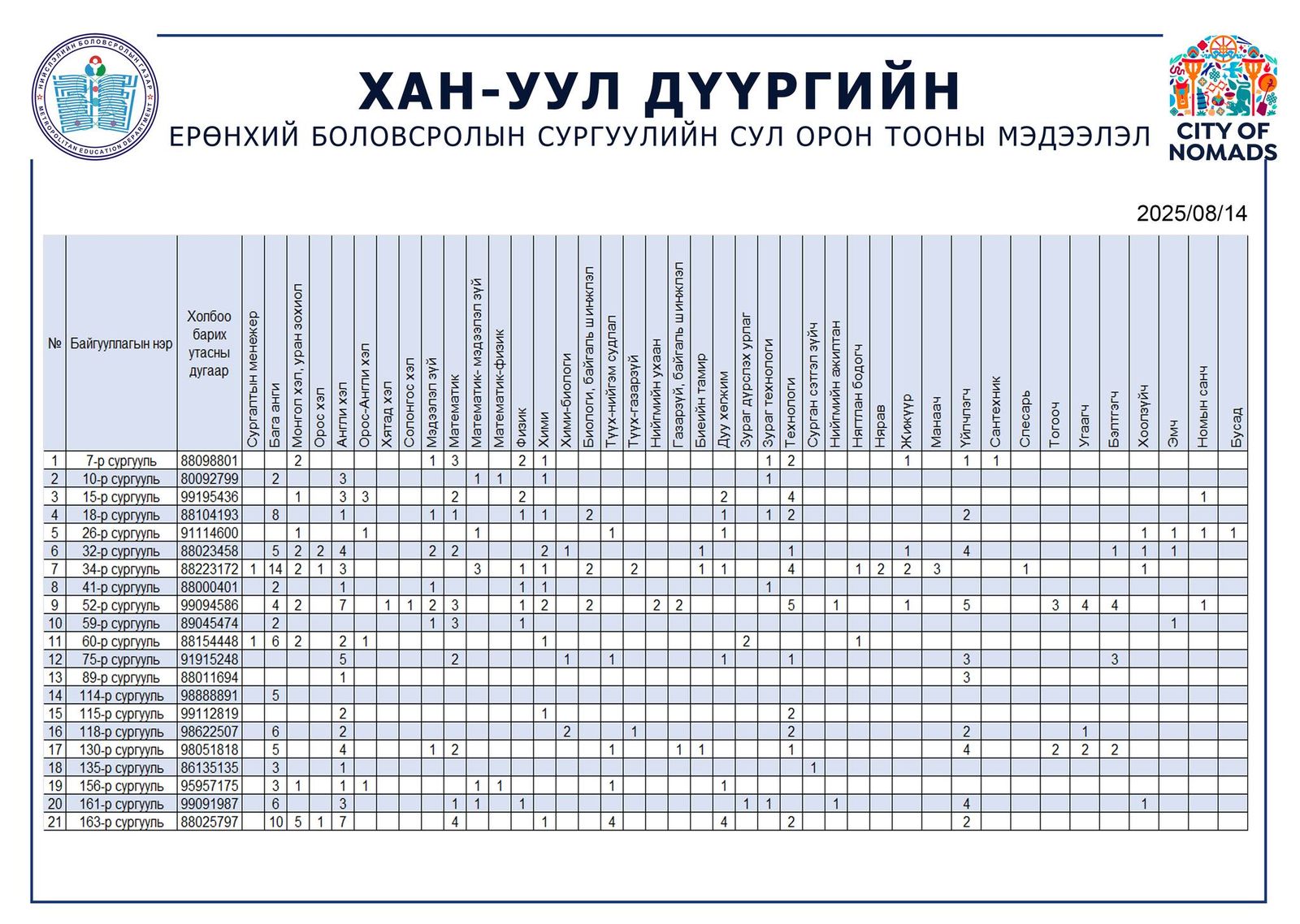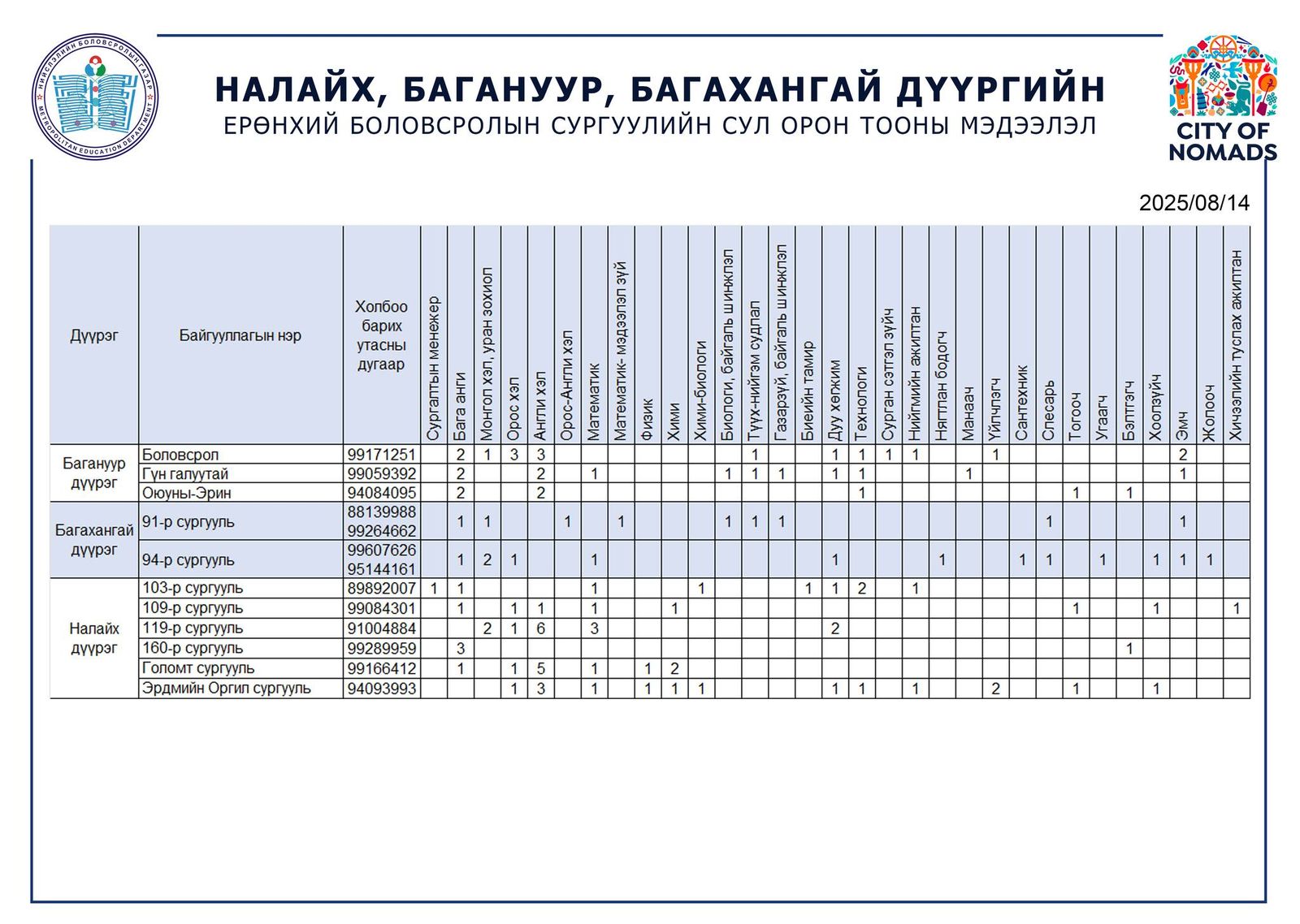2025-2026 оны хичээлийн жилд нийслэлд үйл ажиллагаа явуулж буй төрийн өмчийн ерөнхий боловсролын сургуулиудад дутагдаж буй багш, ажилтны сул орон тооны мэдээллийг Нийслэлийн Боловсролын Газраас танилцууллаа.