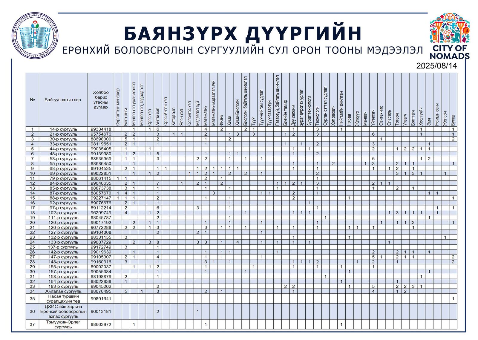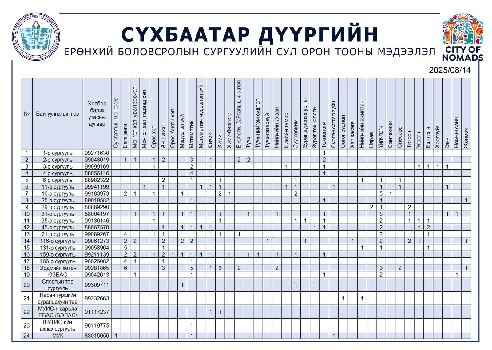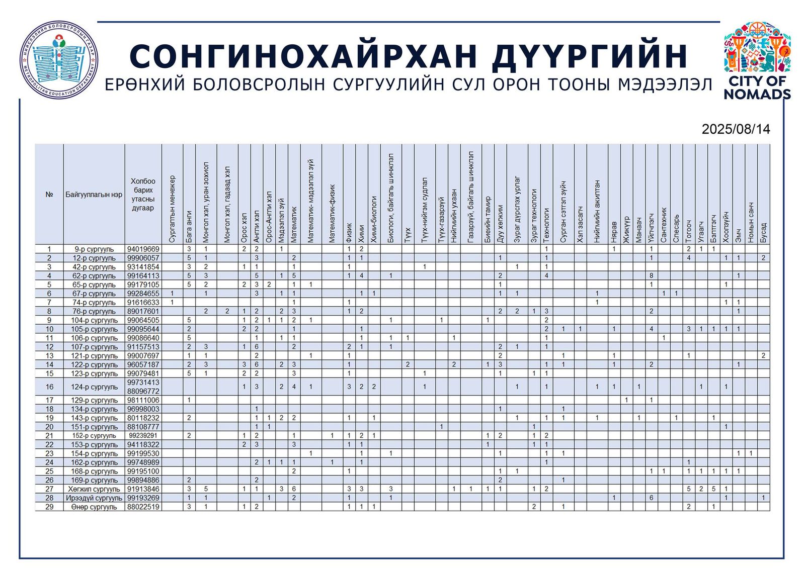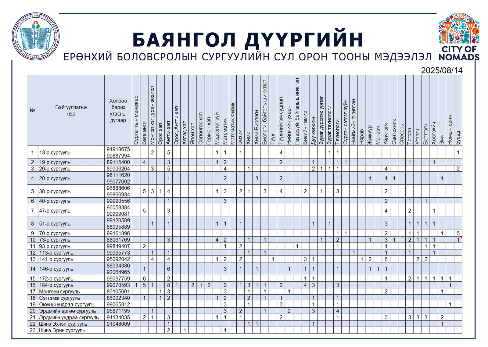 2025-2026 оны хичээлийн жилд нийслэлд үйл ажиллагаа явуулж буй төрийн өмчийн ерөнхий боловсролын сургуулиудад дутагдаж буй багш, ажилтны сул орон тооны мэдээллийг Нийслэлийн Боловсролын Газраас танилцууллаа.