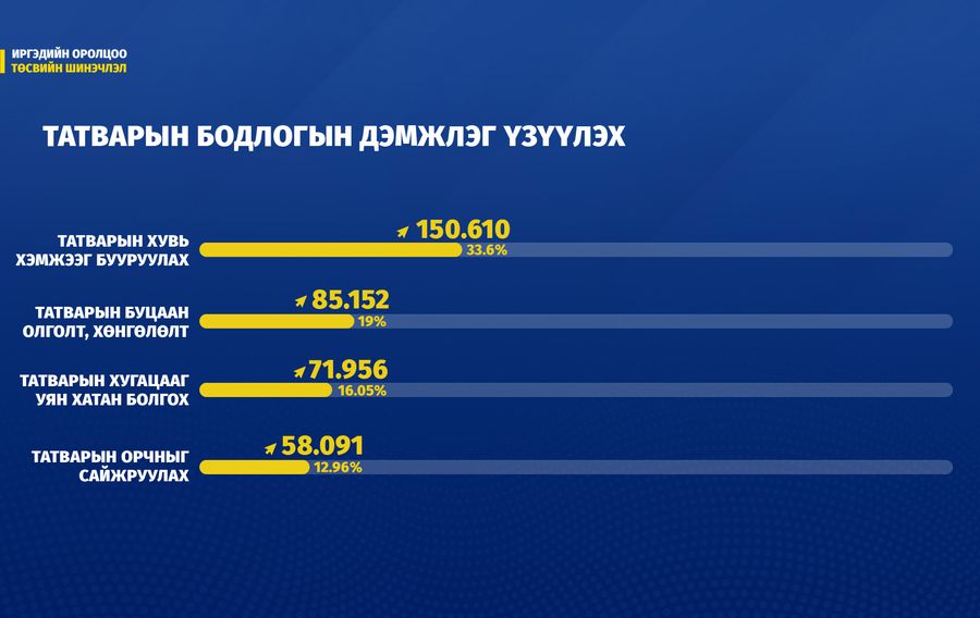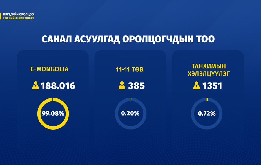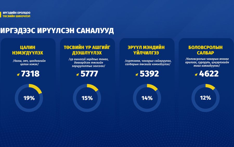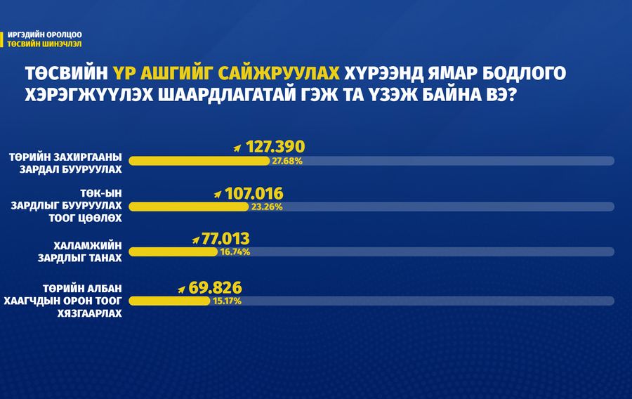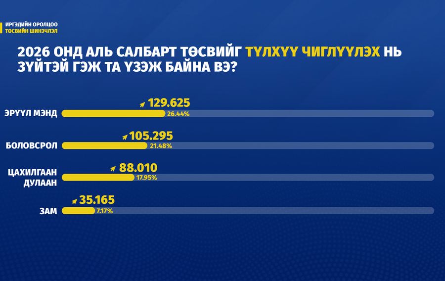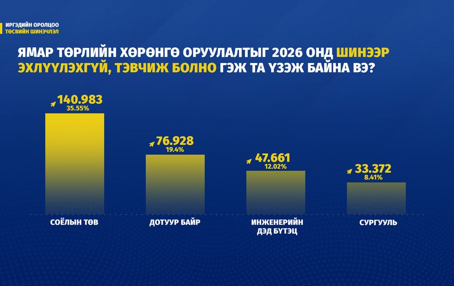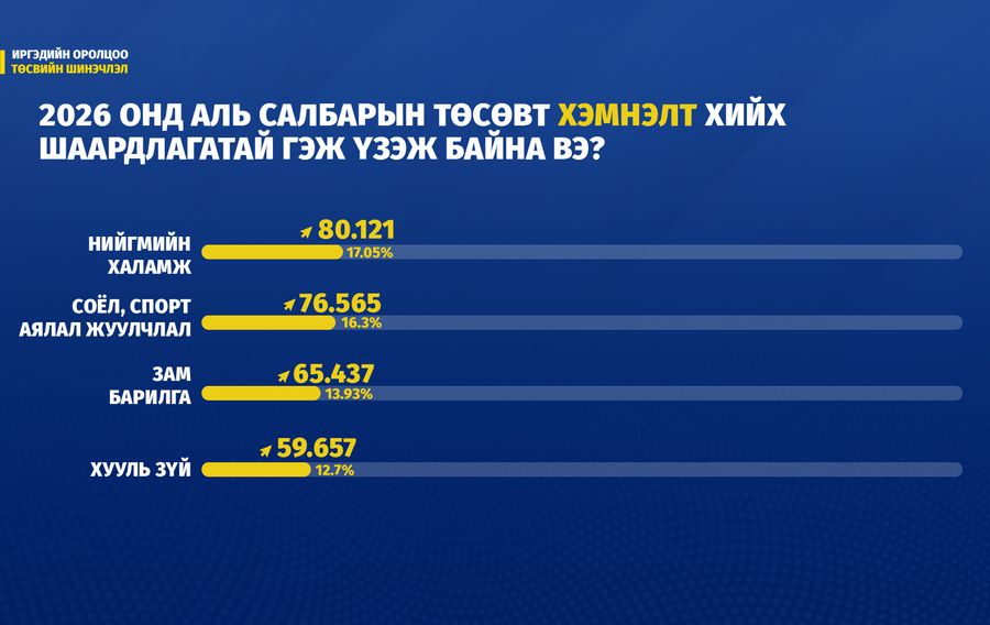 Монгол Улсын 2026 оны төсвийн төсөлд олон нийтээс авсан саналын үр дүнг танилцуулж байна.