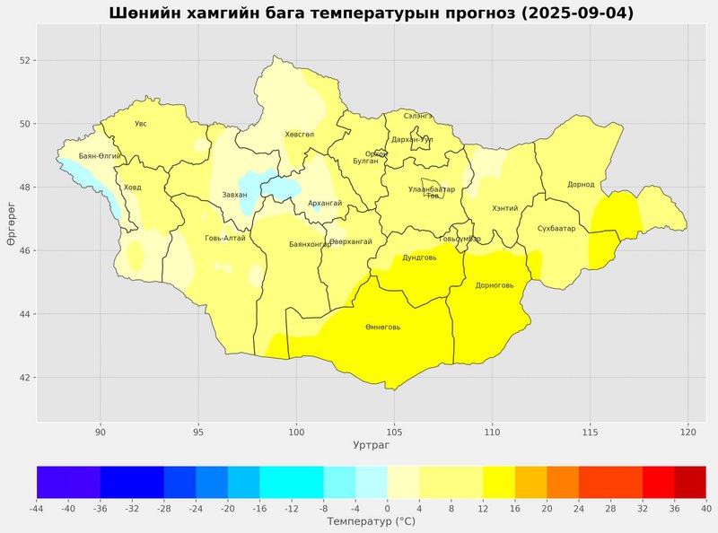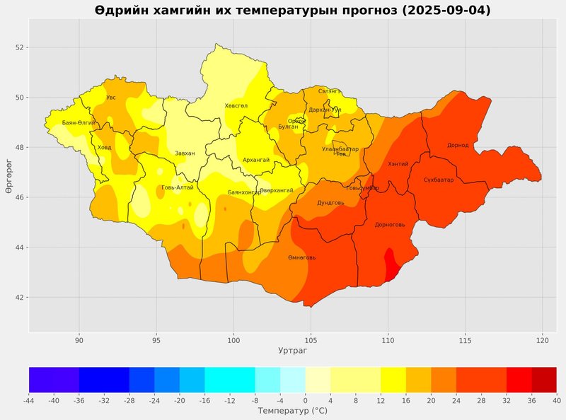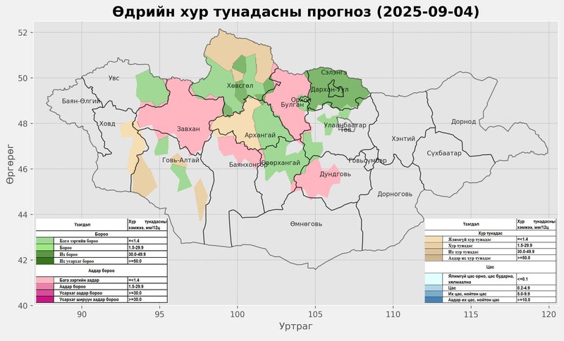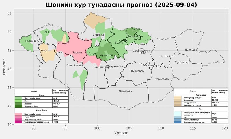Маргааш буюу есдүгээр сарын 04-ний өдөр баруун аймгуудын нутгийн зарим газар, төвийн аймгуудын нутгийн баруун болон хойд хэсгээр бороо, дуу цахилгаантай аадар бороо орж нутгийн баруун хагаст сэрүүсэхийг цаг уурын байгууллагаас мэдээллээ.