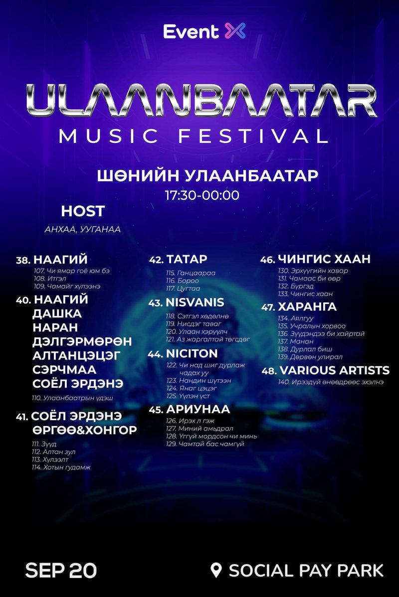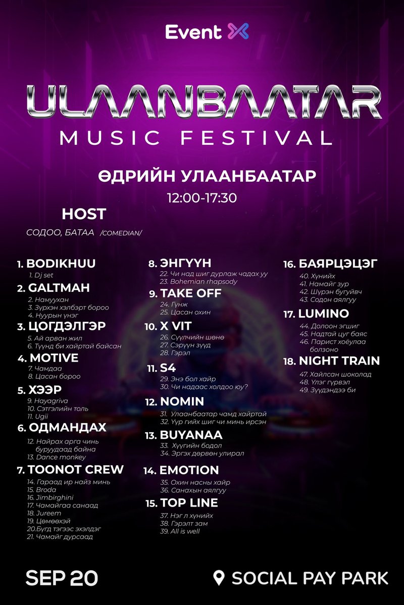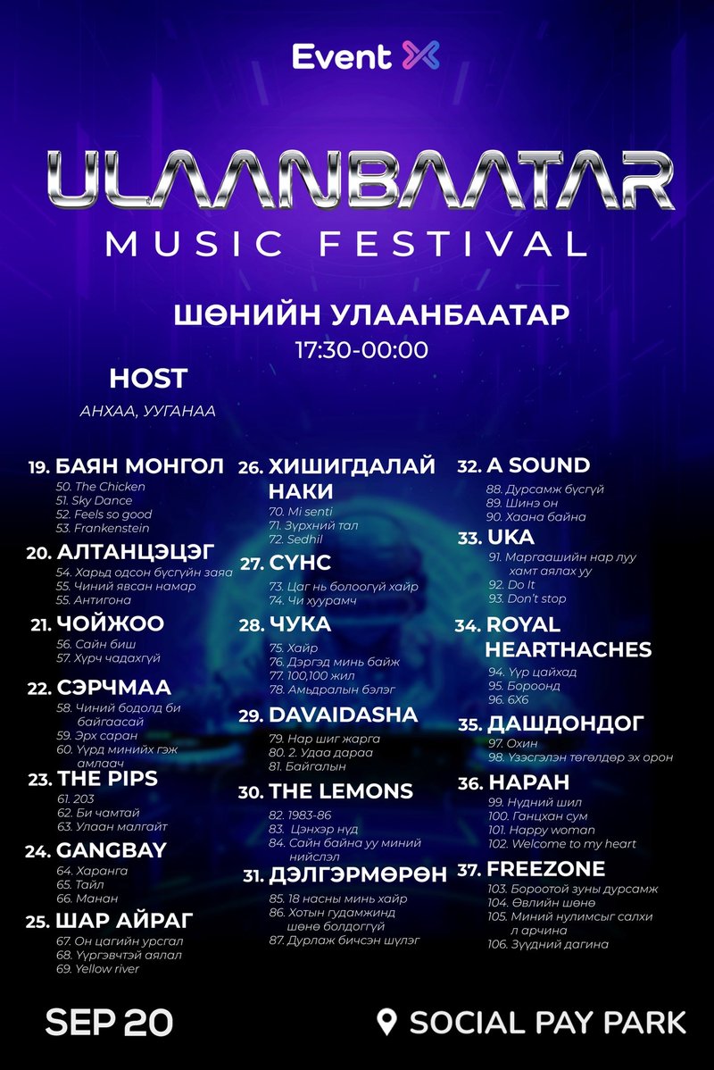 Бүтэн өдөр үргэлжлэх энэ аялалд Монголын шилдэг уран бүтээлчид нэгэн тайзан дээр уулзаж, Улаанбаатар хотын зүрхэнд хөгжим хэзээ ч унтардаггүйг мэдрүүлэх болно. Амжиж тасалбараа аваарай.