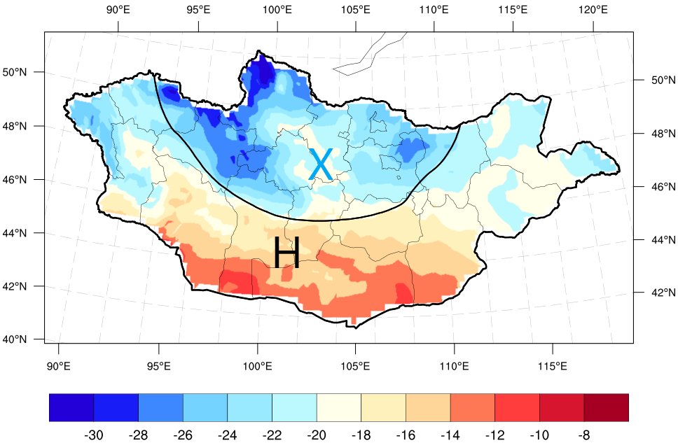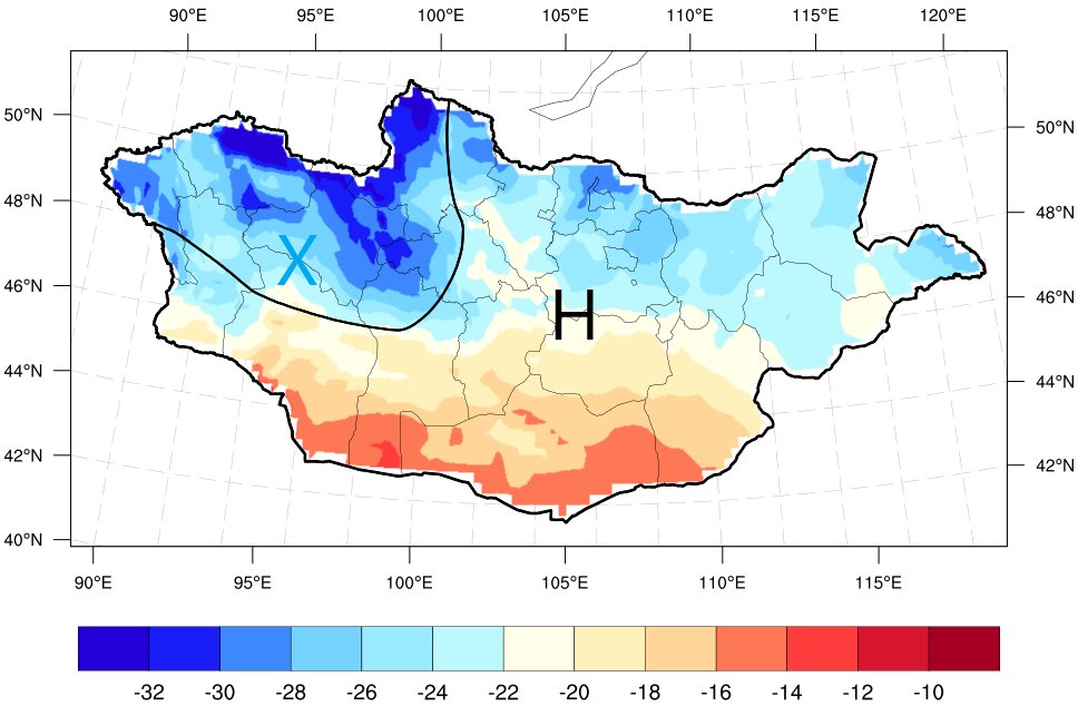 12-р сарын хур тунадас ОЖД 1-р сарын агаарын температурын ОЖД: Баян–Өлгийн нутаг, Увсын хойд болон өмнөд, Завхан, Хөвсгөл, Сэлэнгийн ихэнх, Архангайн баруун, Төвийн зүүн хойд хэсгээр -26…-32°C, Говь–Алтай, Баянхонгор, Дорноговийн өмнөд, Өмнөговийн ихэнх нутгаар -12...-18°C, бусад нутгаар -18...-26°C хүйтэн байдаг.