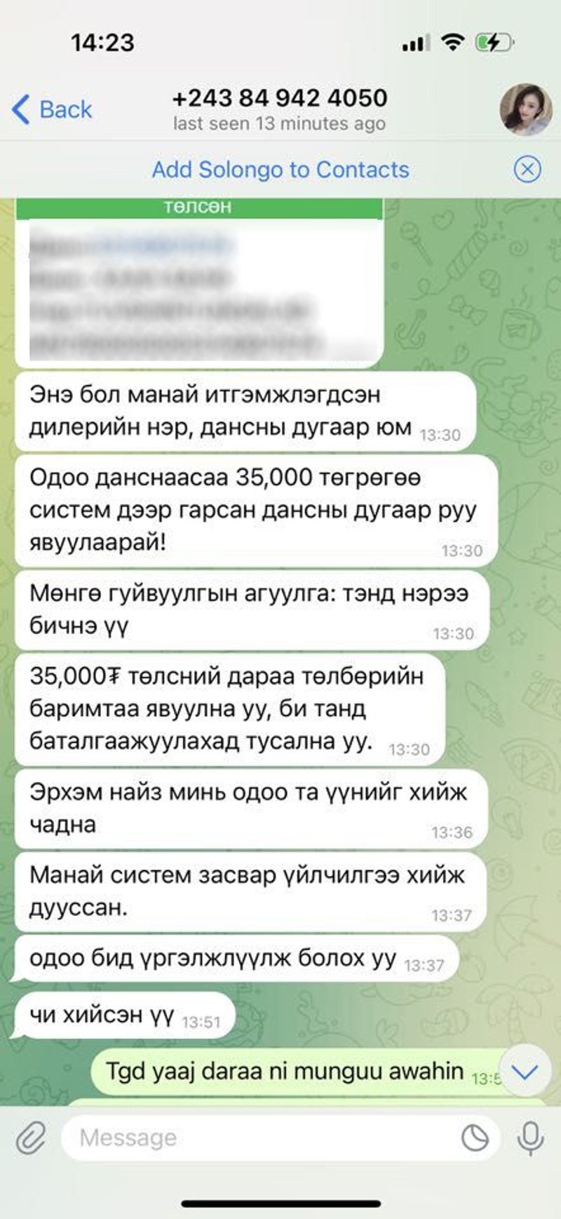 Дээрх этгээд нь Фэйсбүүк орчинд хуурамч зар оруулах, сугалаа зохион байгуулах, иргэдийг Телеграммаар даалгавар гүйцэтгүүлэн залилах гэмт хэрэг үйлдсэн байж болзошгүй нөхцөл байдал тогтоогдоод байна.