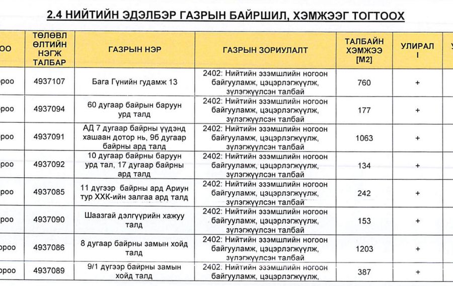 Харин нийтийн эдэлбэрт 41 байршлын 6.36 га газрыг авах аж.