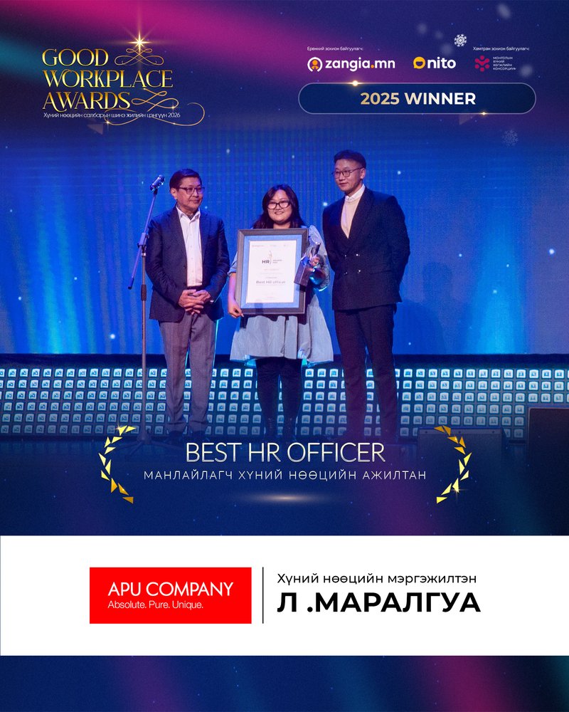 - 𝐁𝐞𝐬𝐭 𝐇𝐑 𝐎𝐟𝐟𝐢𝐜𝐞𝐫 - Манлайлагч хүний нөөцийн ажилтнаар АПУ ХК-ийн Хүний нөөцийн мэргэжилтэн Л. Маралгуа