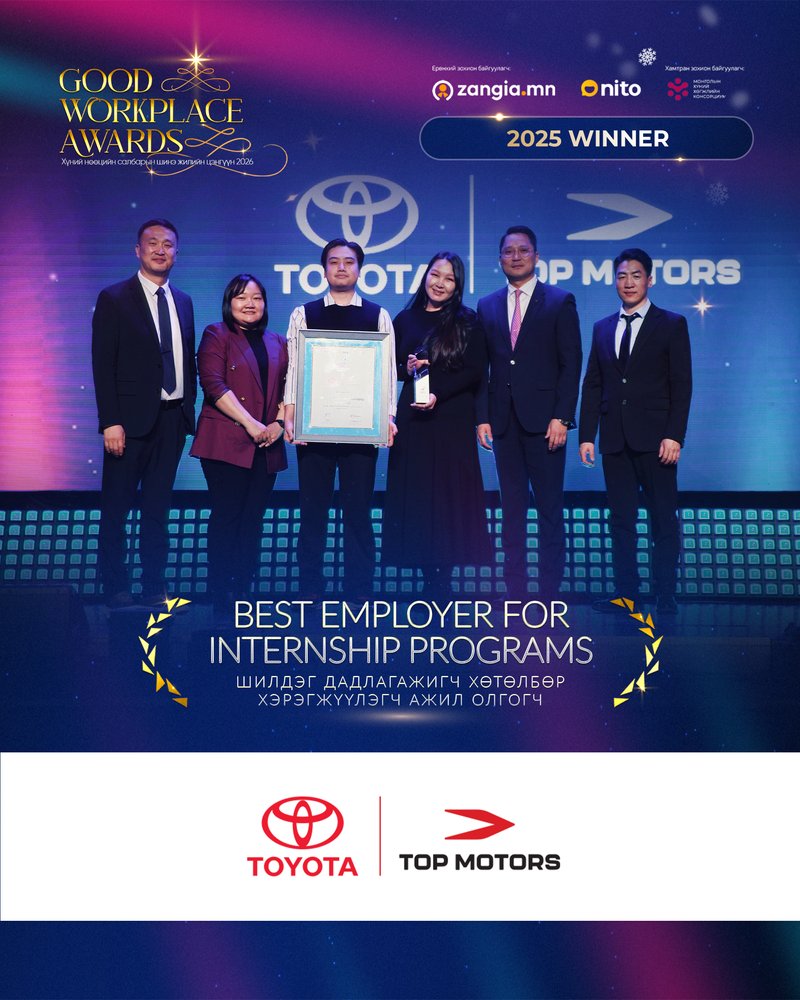 - 𝐁𝐞𝐬𝐭 𝐄𝐦𝐩𝐥𝐨𝐲𝐞𝐫 𝐟𝐨𝐫 𝐈𝐧𝐭𝐞𝐫𝐧𝐬𝐡𝐢𝐩 𝐏𝐫𝐨𝐠𝐫𝐚𝐦𝐬 - Шилдэг дадлагажигч хөтөлбөр хэрэгжүүлэгч ажил олгогчоор Топ моторс ХХК