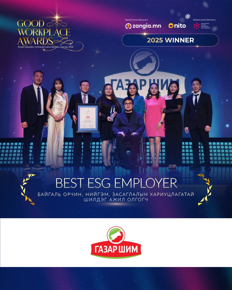 - 𝐁𝐞𝐬𝐭 𝐄𝐒𝐆 𝐄𝐦𝐩𝐥𝐨𝐲𝐞𝐫 - Байгаль орчин, нийгэм, засаглалын хариуцлагатай шилдэг ажил олгогчоор Газар шим Үйлдвэр ХК