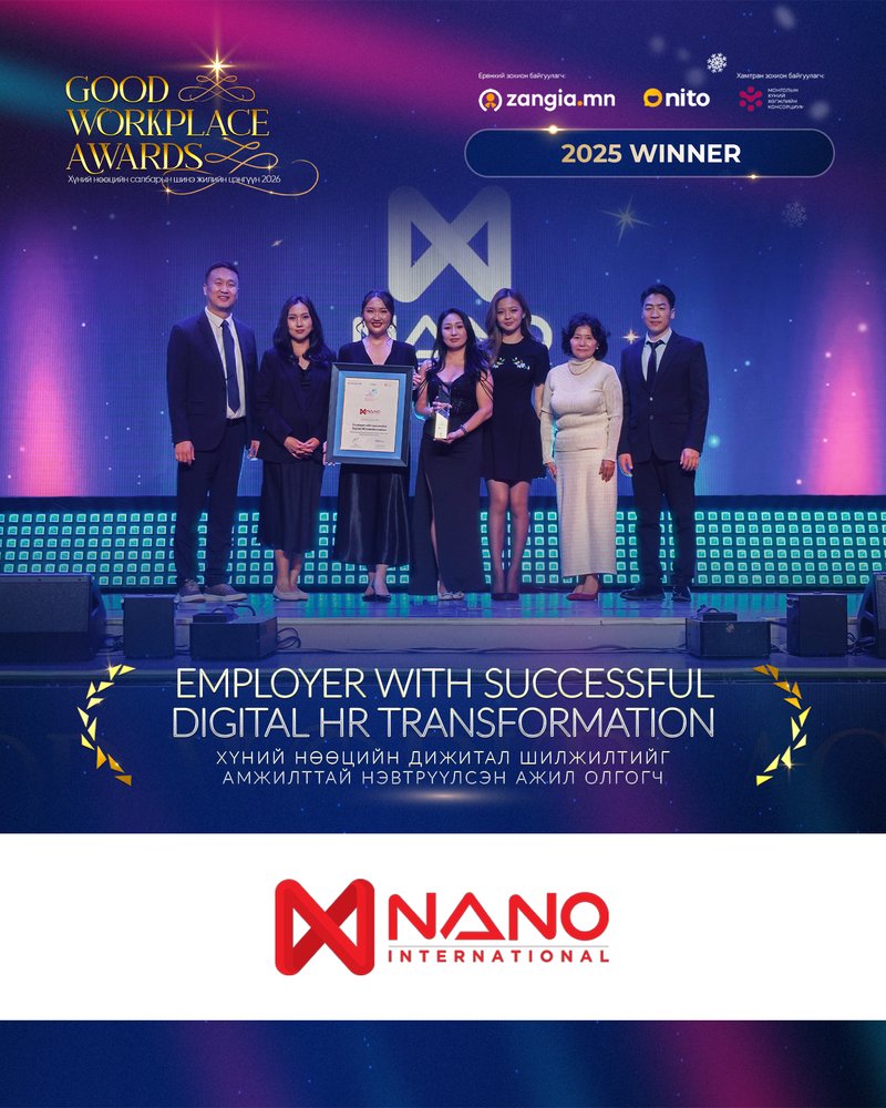 - 𝐄𝐦𝐩𝐥𝐨𝐲𝐞𝐫 𝐰𝐢𝐭𝐡 𝐒𝐮𝐜𝐜𝐞𝐬𝐬𝐟𝐮𝐥 𝐃𝐢𝐠𝐢𝐭𝐚𝐥 𝐇𝐑 𝐓𝐫𝐚𝐧𝐬𝐟𝐨𝐫𝐦𝐚𝐭𝐢𝐨𝐧 - Хүний нөөцийн дижитал шилжилтийг амжилттай нэвтрүүлсэн шилдэг ажил олгогчоор Нано Интернэйшнл ХХК