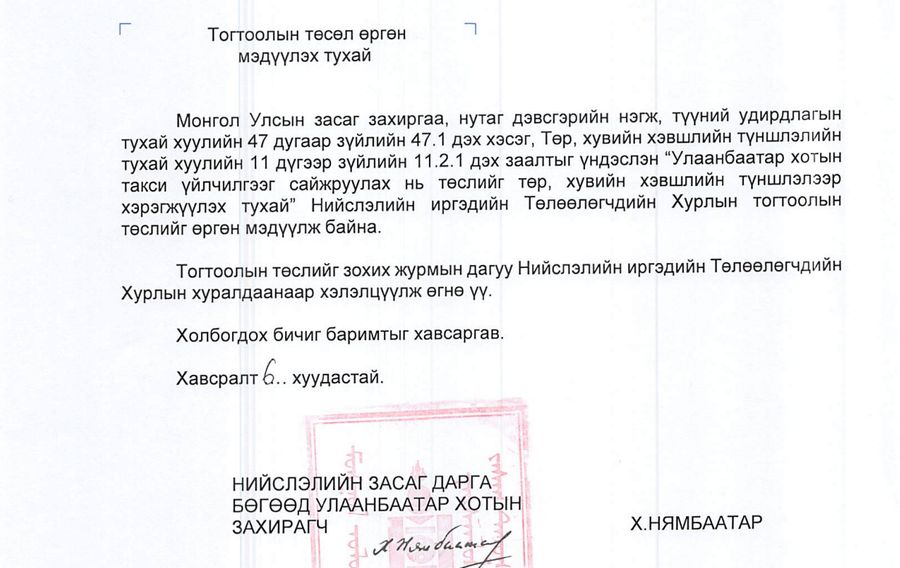 Улаанбаатар хотын такси үйлчилгээг төр, хувийн хэвшлийн түншлэлээр сайжруулах тухай тогтоолын төслийн танилцуулгад "Улаанбаатар хотын албан ёсны такси үйлчилгээнд төр, хувийн хэвшлийн түншлэлээр цахилгаан хөдөлгүүртэй/PHEV/ 2,000 автомашиныг таван жилийн хугацаанд авч, нэгдсэн удирдлагын системд холбож үйлчилгээнд явуулна. Эхний жилд 1,000, гурав, тав дахь жилд тус бүр 500 такси авна" гэх агуулга бүхий хэсэг байсан юм. Одоо ч уг тогтоолын төслийн танилцуулга нээлттэй байгаа билээ.