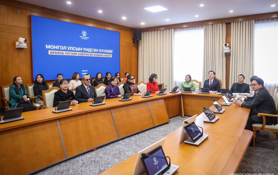 Монгол брайль үсгээр хэвлэсэн Монгол Улсын Үндсэн хуулийг Улсын Их Хурлын дарга Н.Учрал өнөөдөр /2026.01.12/ танилцуулж, дээжийг нь Монголын хараагүйчүүдийн үндэсний холбоо болон Монголын номын сангийн консерцумын төлөөлөлд гардуулан өглөө.