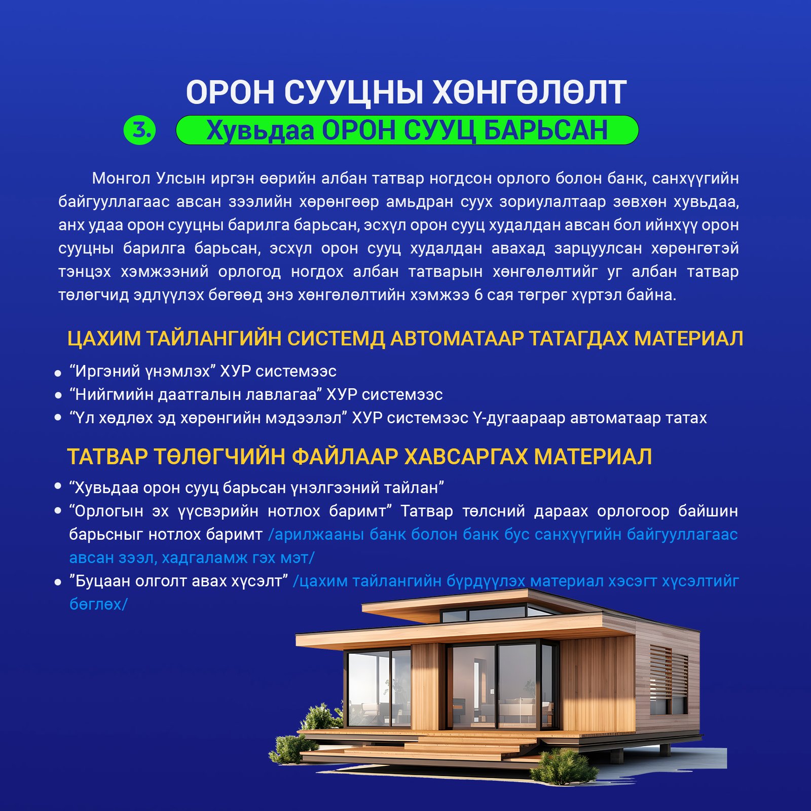 Ингэснээр анх удаа орон сууц худалдаж авсны буцаан олголтоо авах боломжтой юм. Уг тайлангаа хэрхэн гаргах, шаардлагатай материалыг яаж хавсаргах талаар Монголын Татварын Албанаас зөвлөгөө мэдээлэл гаргасныг хүргэж байна.