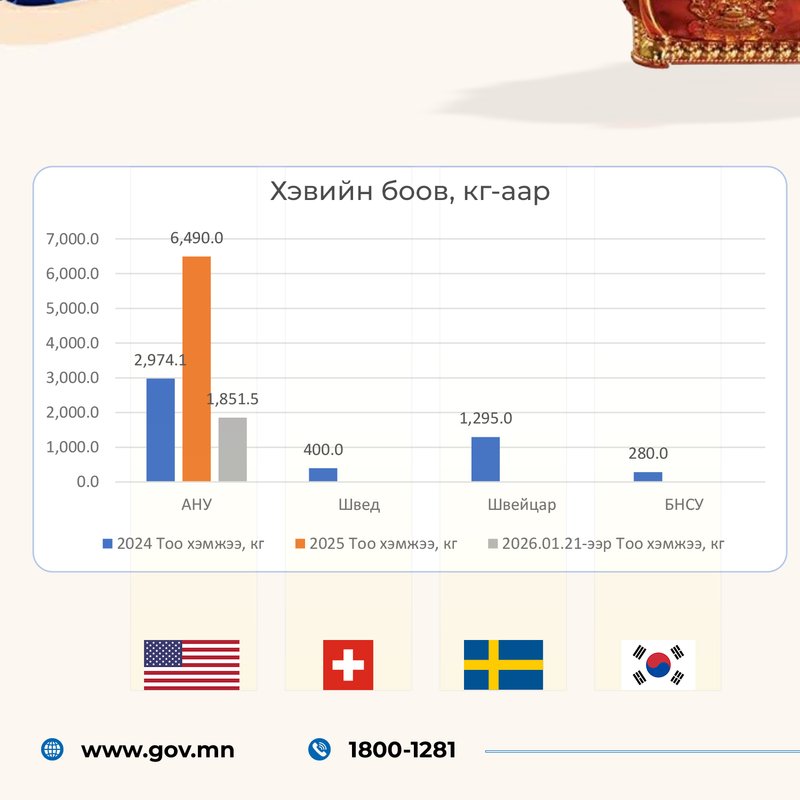 Манай улс 2024 онд Швед, Швейцар, БНСУ руу нийт 1,975 кг хэвийн боов экспортолсон бол сүүлийн гурван жилд АНУ руу тогтмол экспортолжээ.
