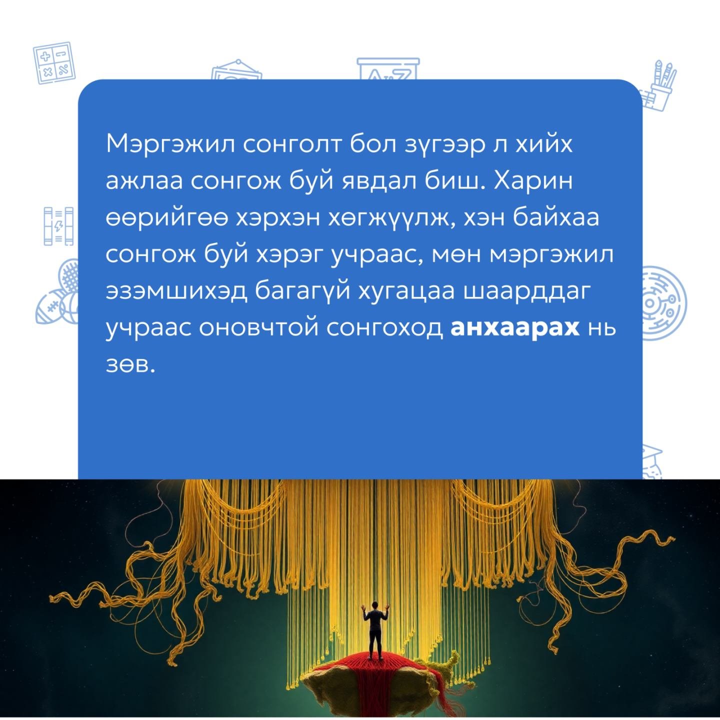Мэргэжил сонголт бол зүгээр л хийх ажлаа сонгож буй үйл явц биш. Харин өөрийгөө хэрхэн хөгжүүлж, хэн байхаа сонгож буй хэрэг учраас, мөн мэргэжил эзэмшихэд хугацаа шаарддаг тул оновчтой сонгоход анхаарах нь зөв юм.