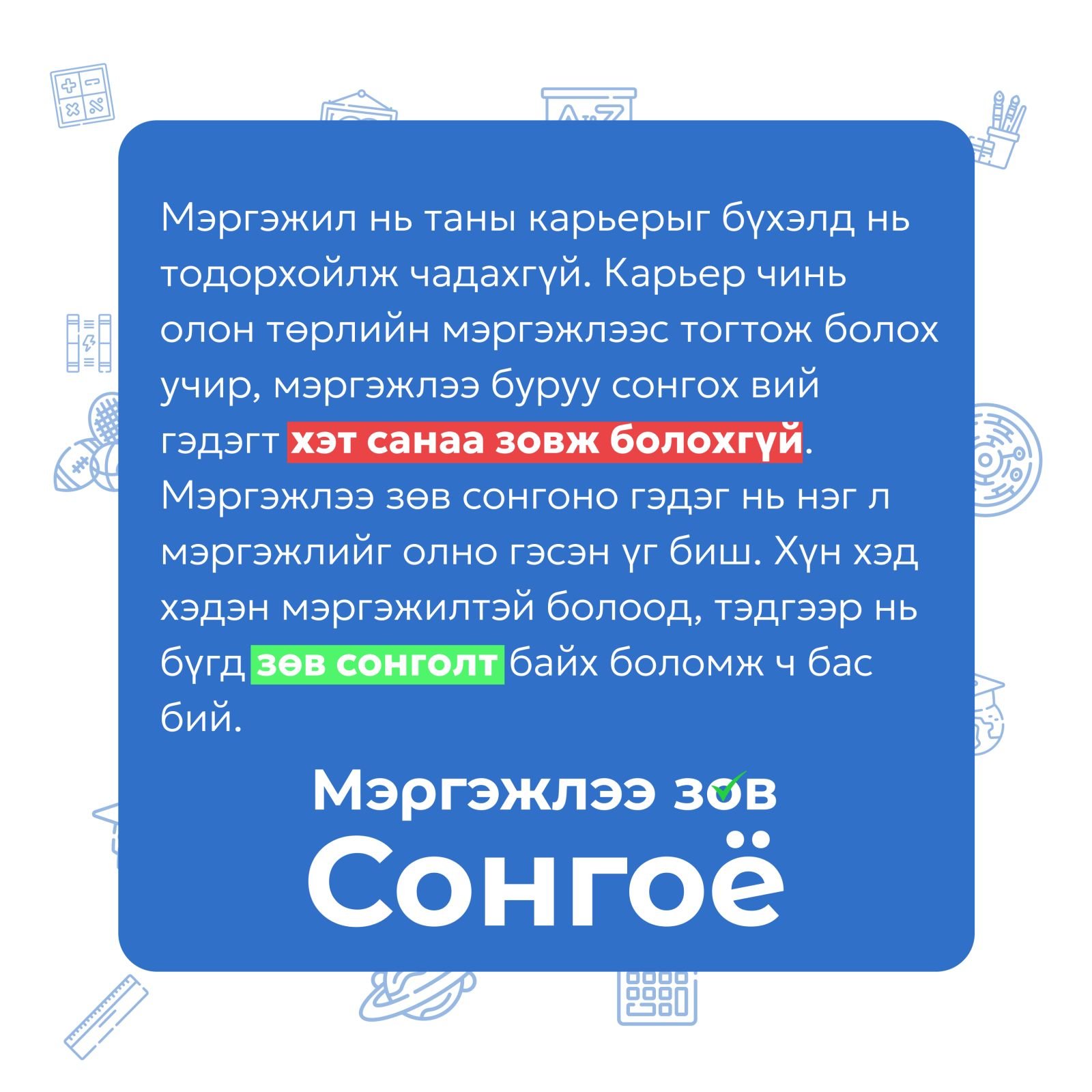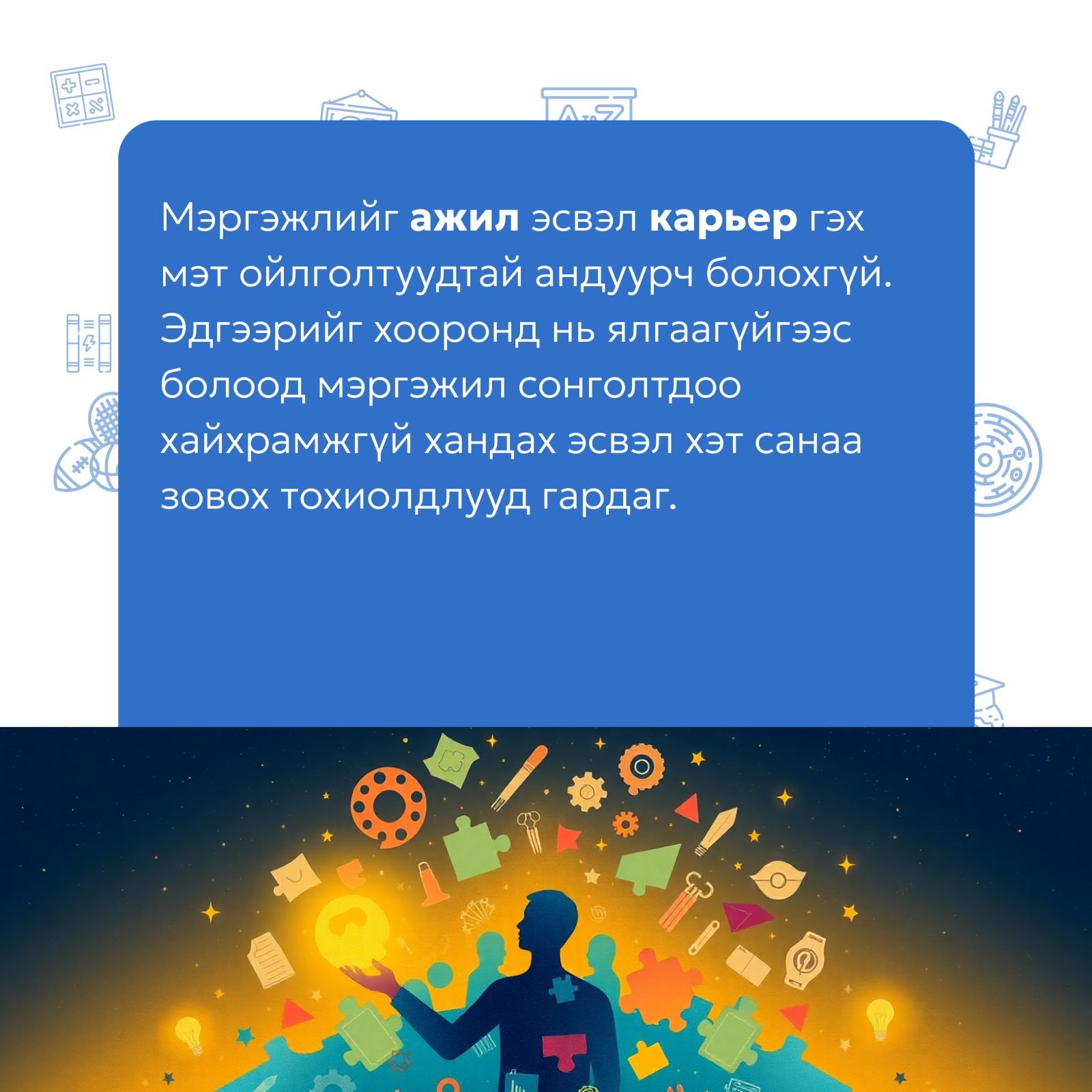 Иймд Боловсролын Ерөнхий Газар(БЕГ)-аас мэргэжлээ сонгохоос өмнө мэргэжил гэж юу болох, ажил, эсвэл карьераас юугаараа ялгаатайг ойлгох хэрэгтэйг зөвлөж байна.