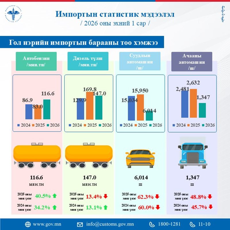 2026 оны эхний нэг сард суудлын 6,014 автомашин импортолсон нь өмнөх оны мөн үеэс 62.3%-аар буурч, ачааны автомашин импорт 1,347 ширхэг оруулсан нь жилийн өмнөхөөс 48.8%-иар тус тус буурсан гэж Гаалийн Ерөнхий Газар(ГЕГ)-аас мэдээллээ.