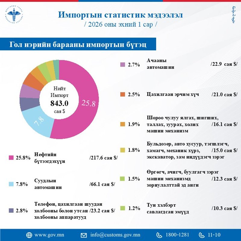Монгол Улс 2026 оны эхний нэг сард 843 сая ам.долларын бараа импортоор авчээ.