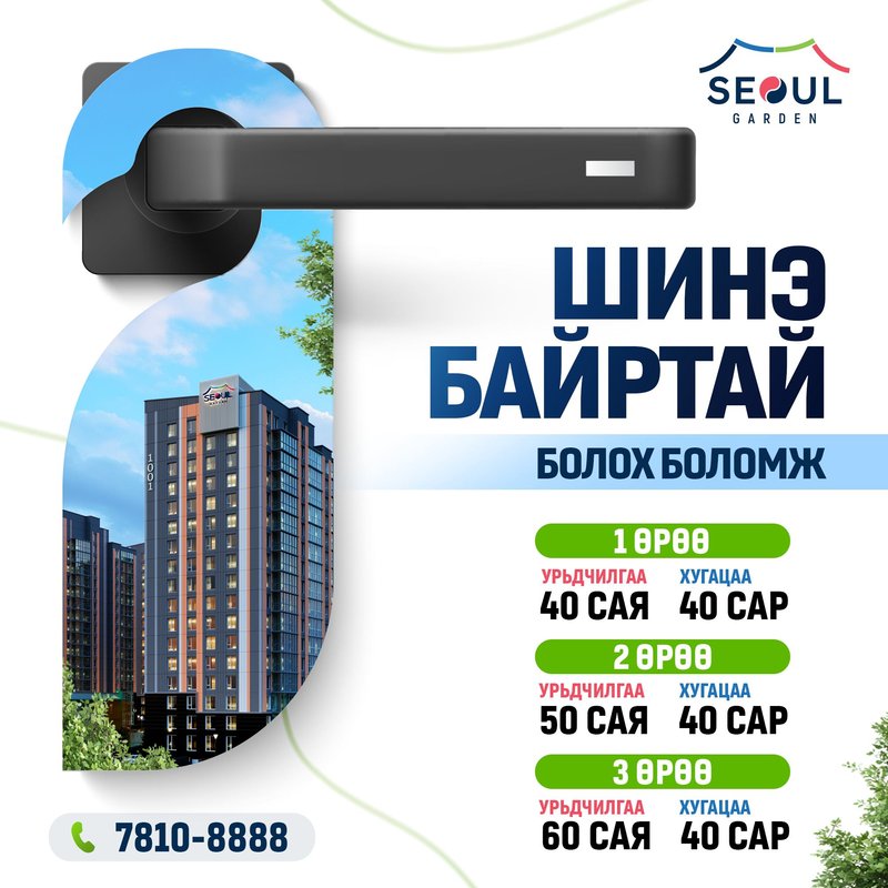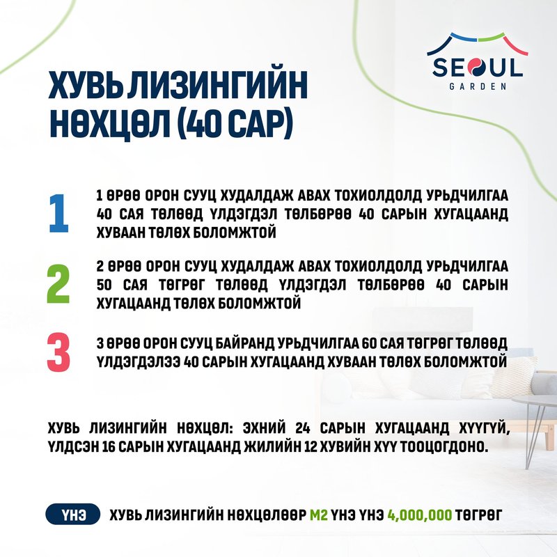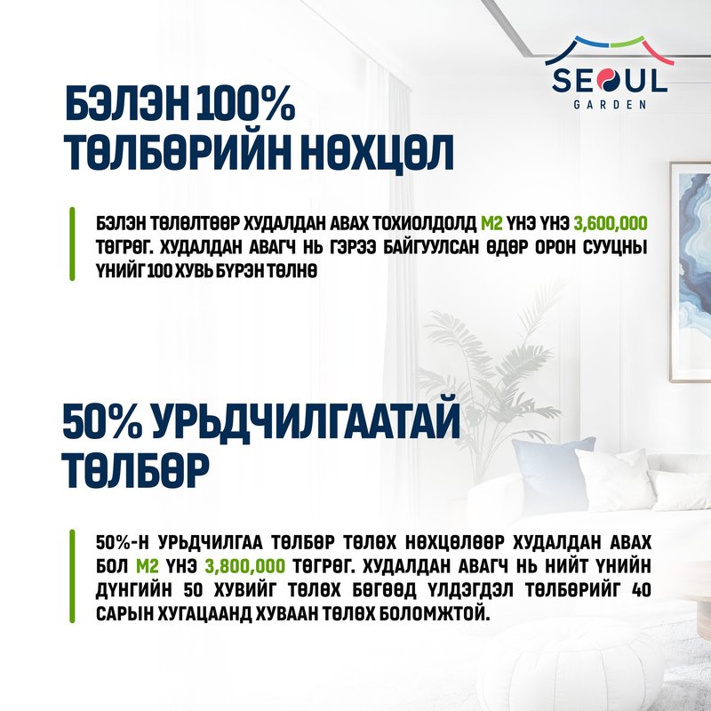 Та Сөүл Гарден хотхоны 6-р блокоос 1 өрөө байр урьдчилгаа 40 сая 40 сар, 2 өрөө байр урьдчилгаа 50 сая 40 сар, 3 өрөө байр урьдчилгаа 60 сая 40 сар гэсэн нөхцөлүүдээс сонголтоо хийн байраа захиалах боломжтой.