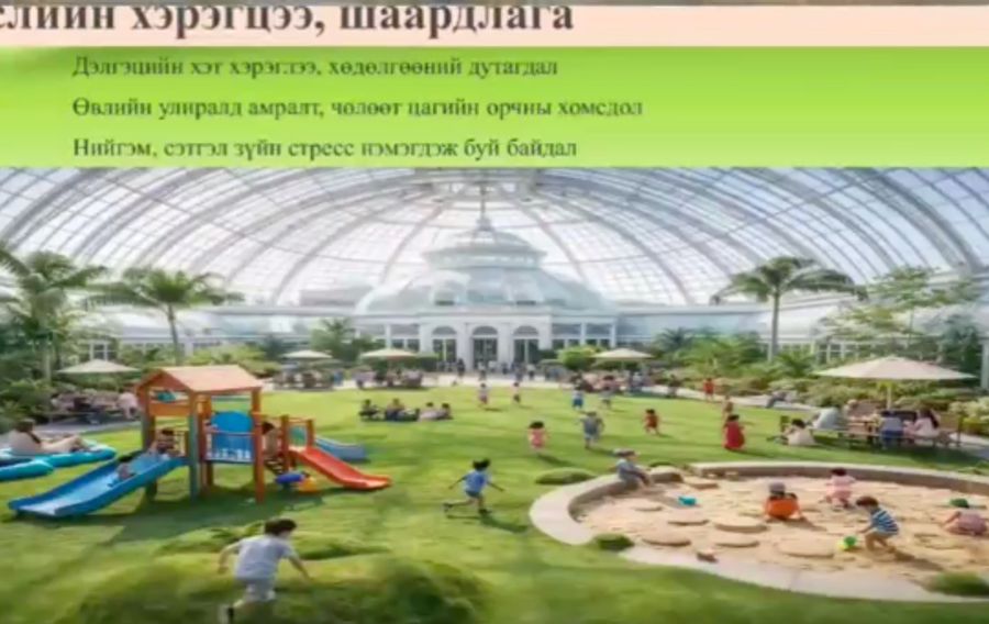 Нийслэлийн Иргэдийн Төлөөлөгчдийн Хурлын ээлжит хуралдаанаар төр, хувийн хэвшлийн түншлэлээ Улаанбаатарт өвлийн улиралд гадна орчинд идэвхтэй хөдөлгөөн хийх, цэвэр агаарт гарах боломж хязгаарлагдмал байдаг учир хотын иргэдийн эрүүл, аюулгүй орчинд амьдрах орчны нөхцөлийг бүрдүүлэхээр "Дөрвөн улирлын цэцэрлэгт хүрээлэн" төслийг хувийн хэвшлийн санаачлан ирүүлсэн талаар НЗД-ын Эдийн засгийн хөгжил, дэд бүтцийн асуудал хариуцсан түр орлогч Т.Даваадалай танилцуулав.