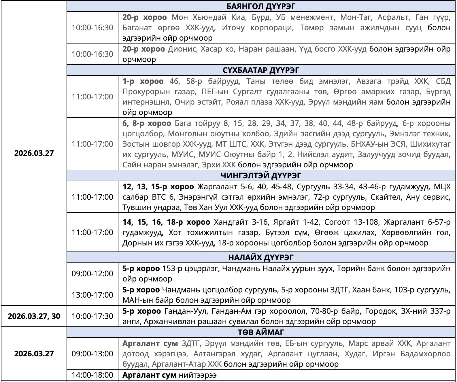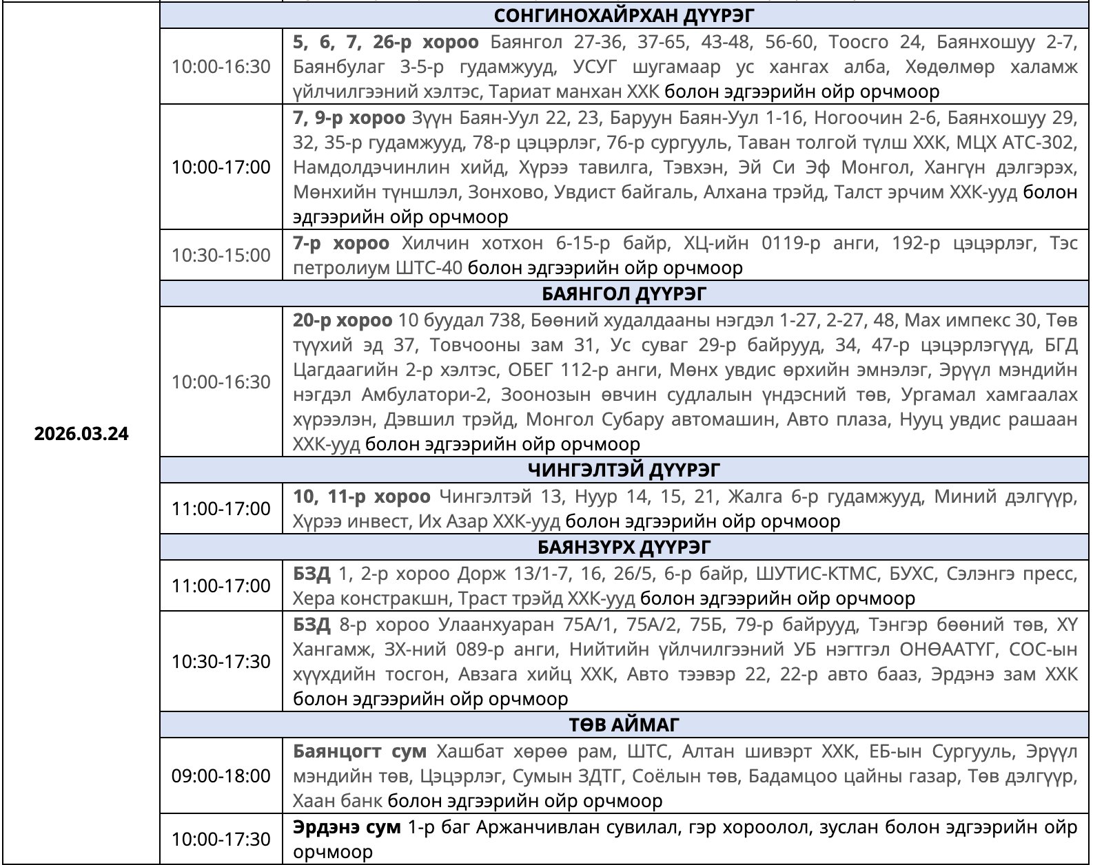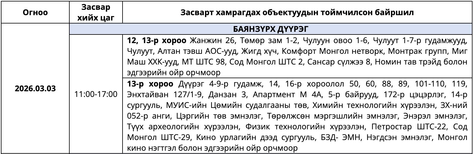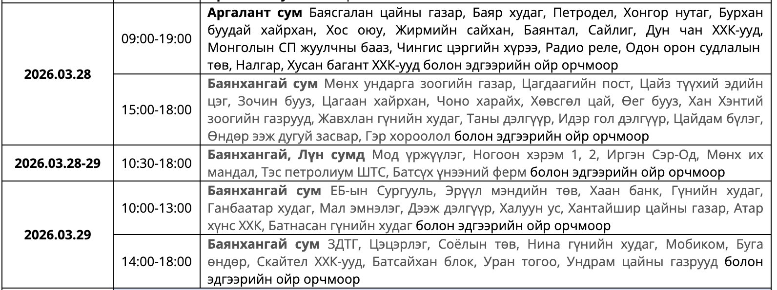 Мөн засварын ажлыг тухайн тоноглолыг хүчдэлээс бүрэн чөлөөлсний дараа хийдэг ажлын нөхцөлийг ойлгож, хүлээцтэй хандахыг хүсэв. Цаг агаарын байдлаас шалтгаалан хуваарьт өөрчлөлт орох тохиолдолд гэрээнд бүртгэгдсэн утасны дугаарт мэдээллийг хүргэх юм байна.