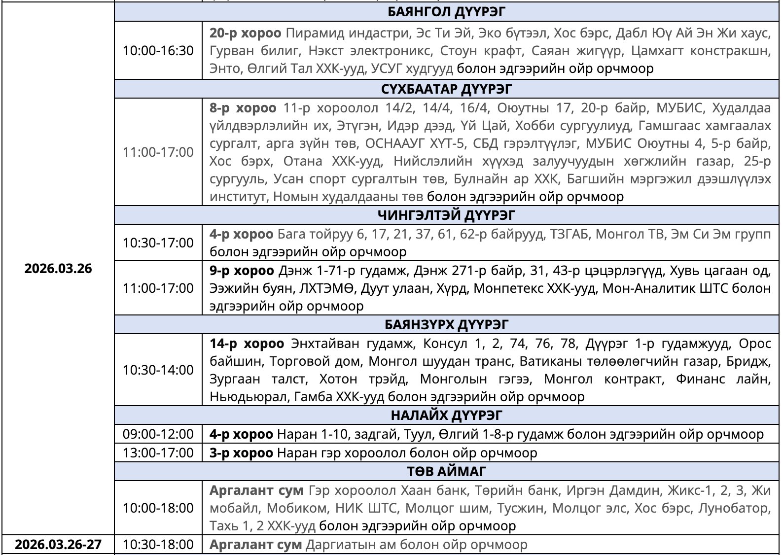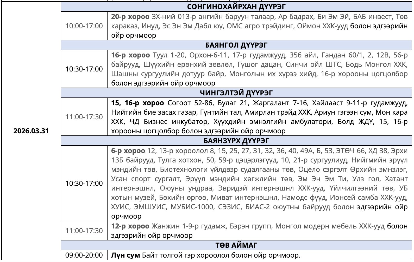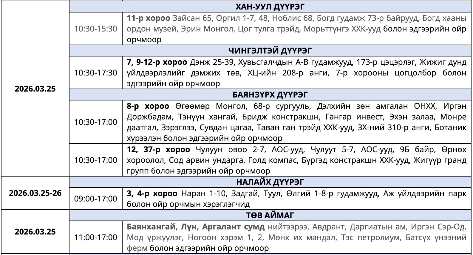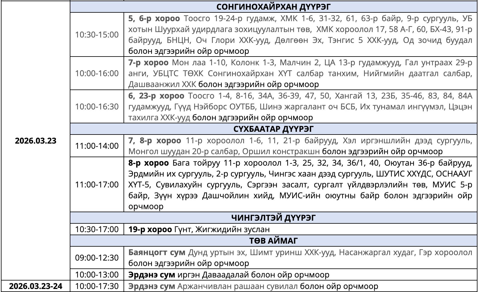 Мөн засварын ажлыг тухайн тоноглолыг хүчдэлээс бүрэн чөлөөлсний дараа хийдэг ажлын нөхцөлийг ойлгож, хүлээцтэй хандахыг хүсэв. Цаг агаарын байдлаас шалтгаалан хуваарьт өөрчлөлт орох тохиолдолд гэрээнд бүртгэгдсэн утасны дугаарт мэдээллийг хүргэх юм байна.
