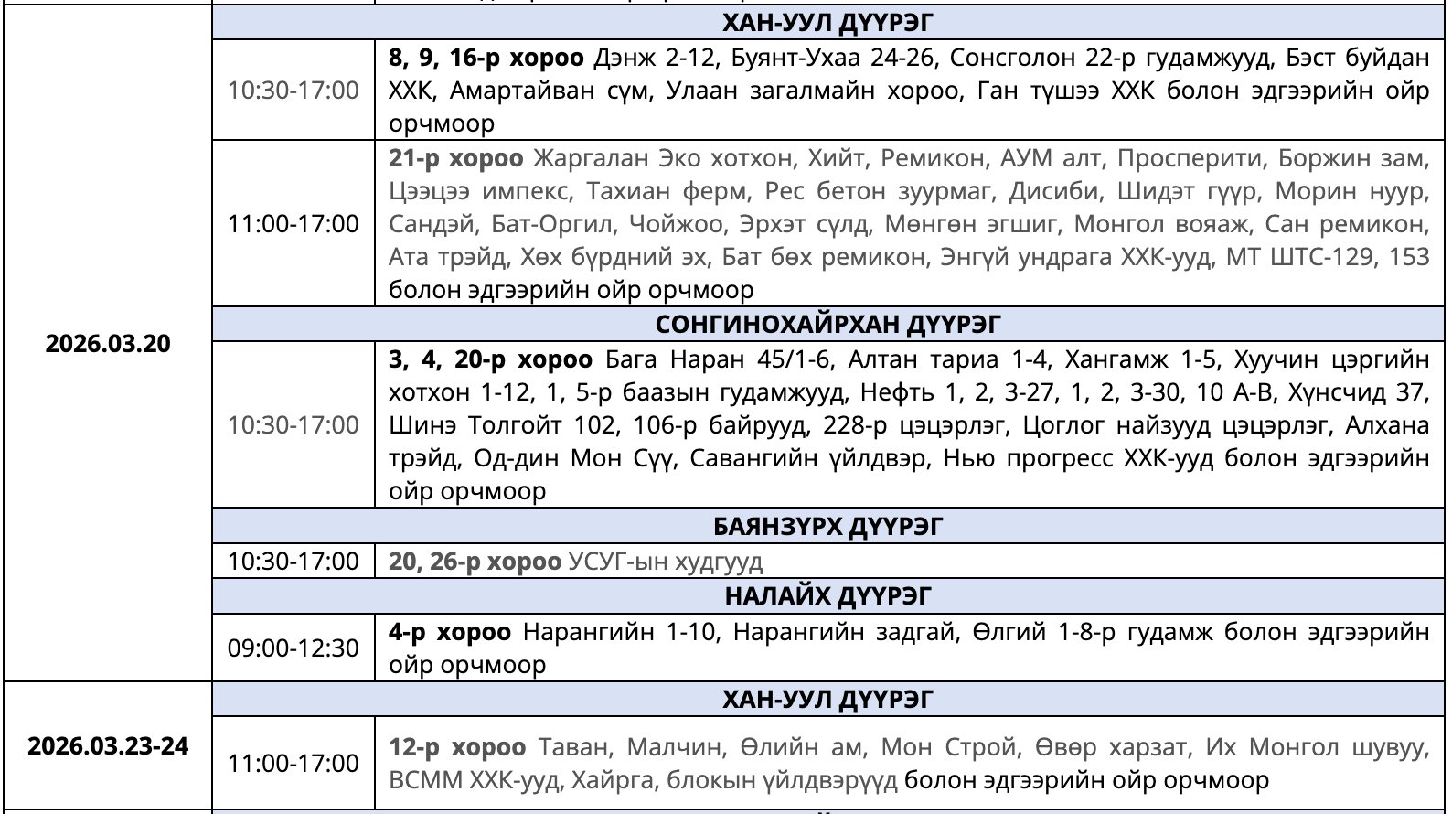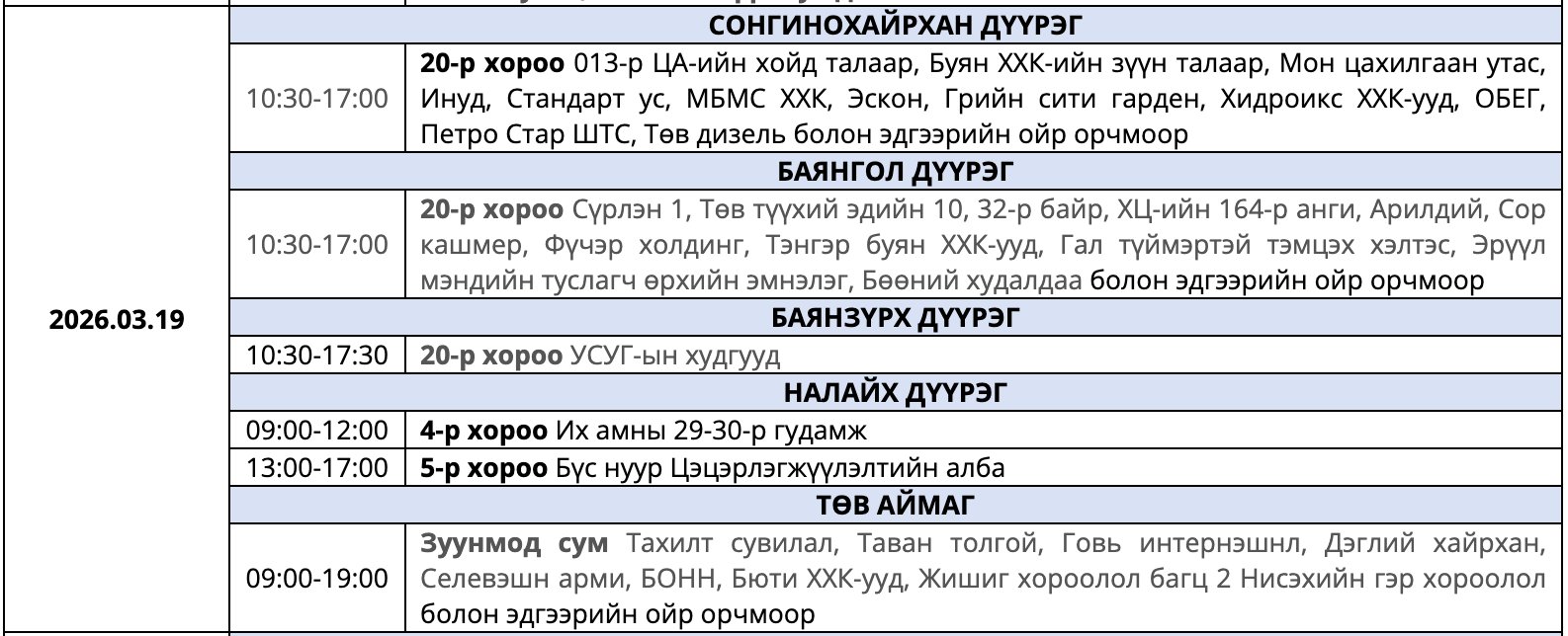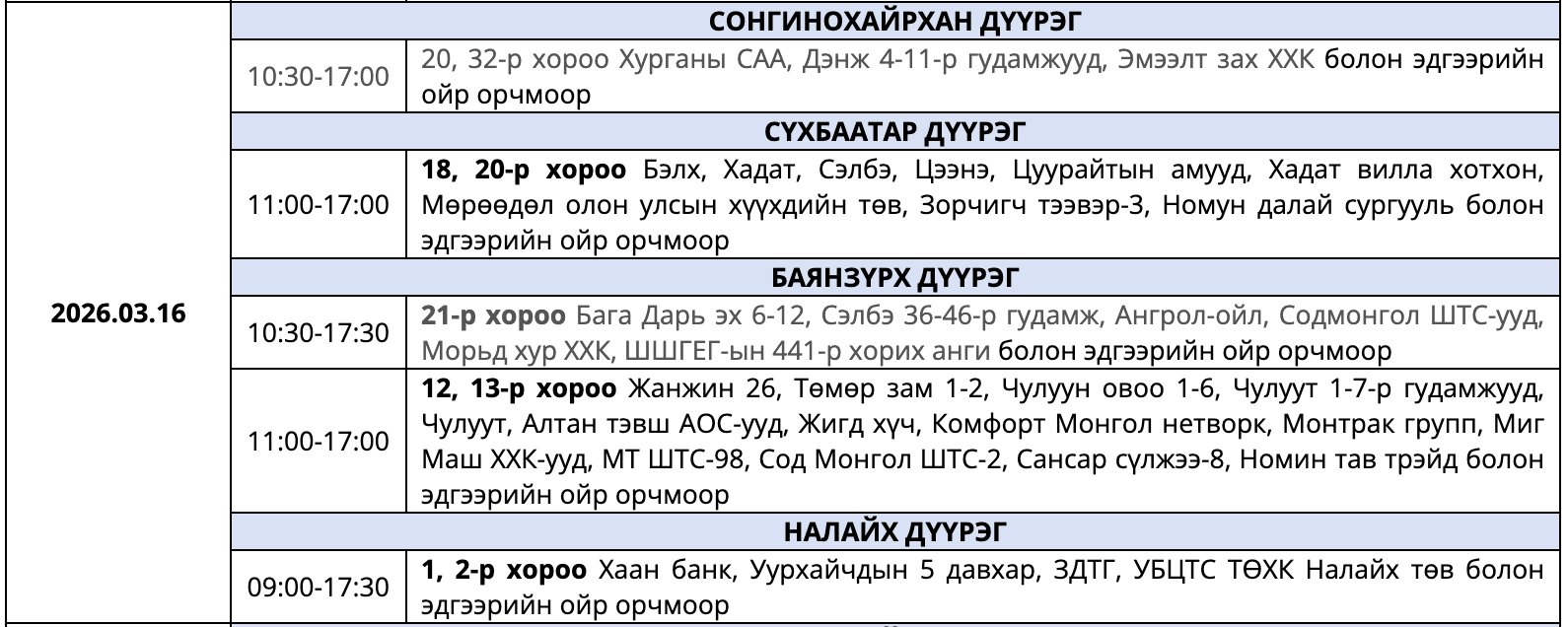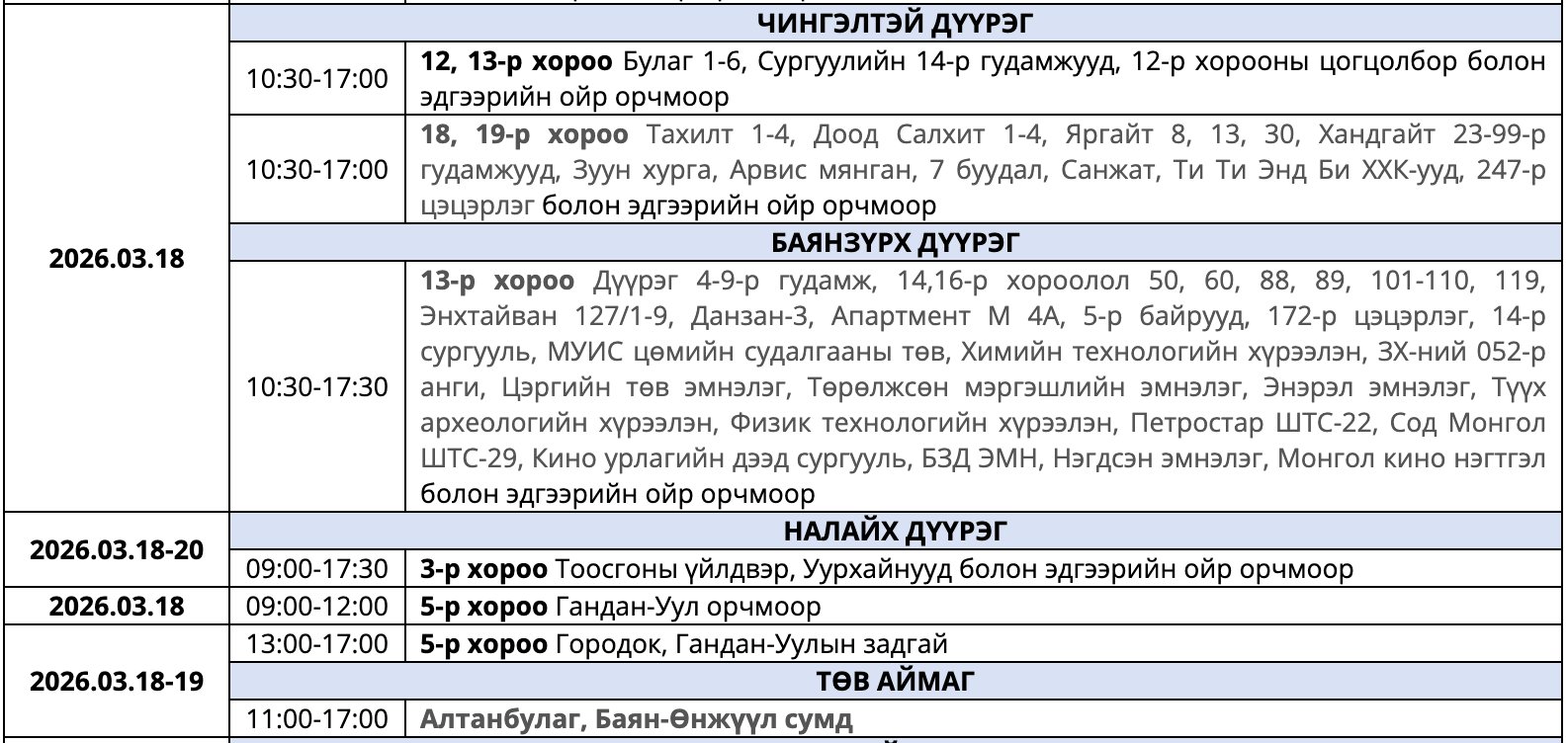 Улаанбаатар Цахилгаан Түгээх Сүлжээ(УБЦТС) ТӨХК 2026 оны гуравдугаар сард цахилгаан шугам тоноглолд засвар хийх тоймчилсон байршил, цагийн хуваарийг мэдээллээ.
