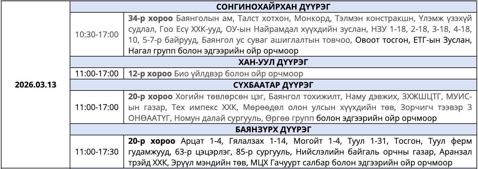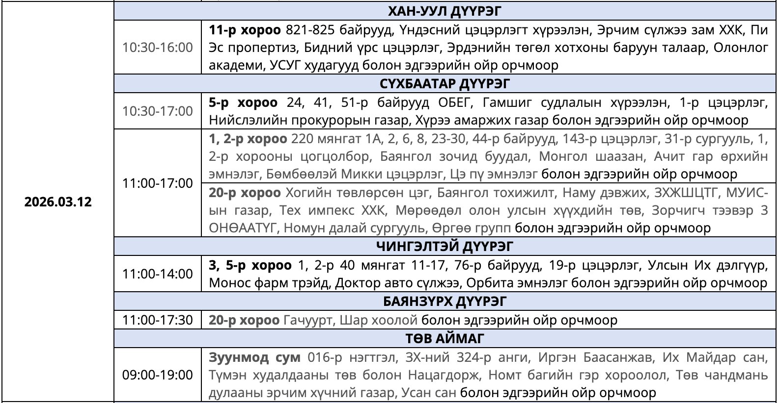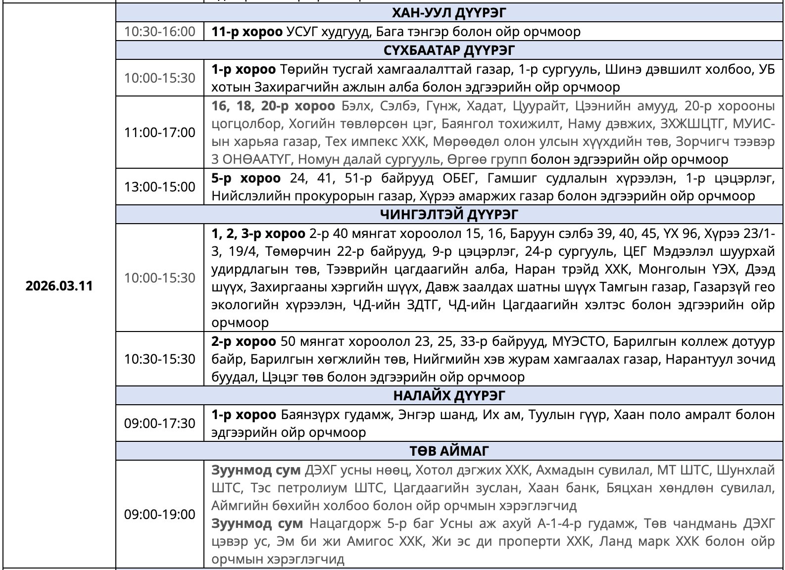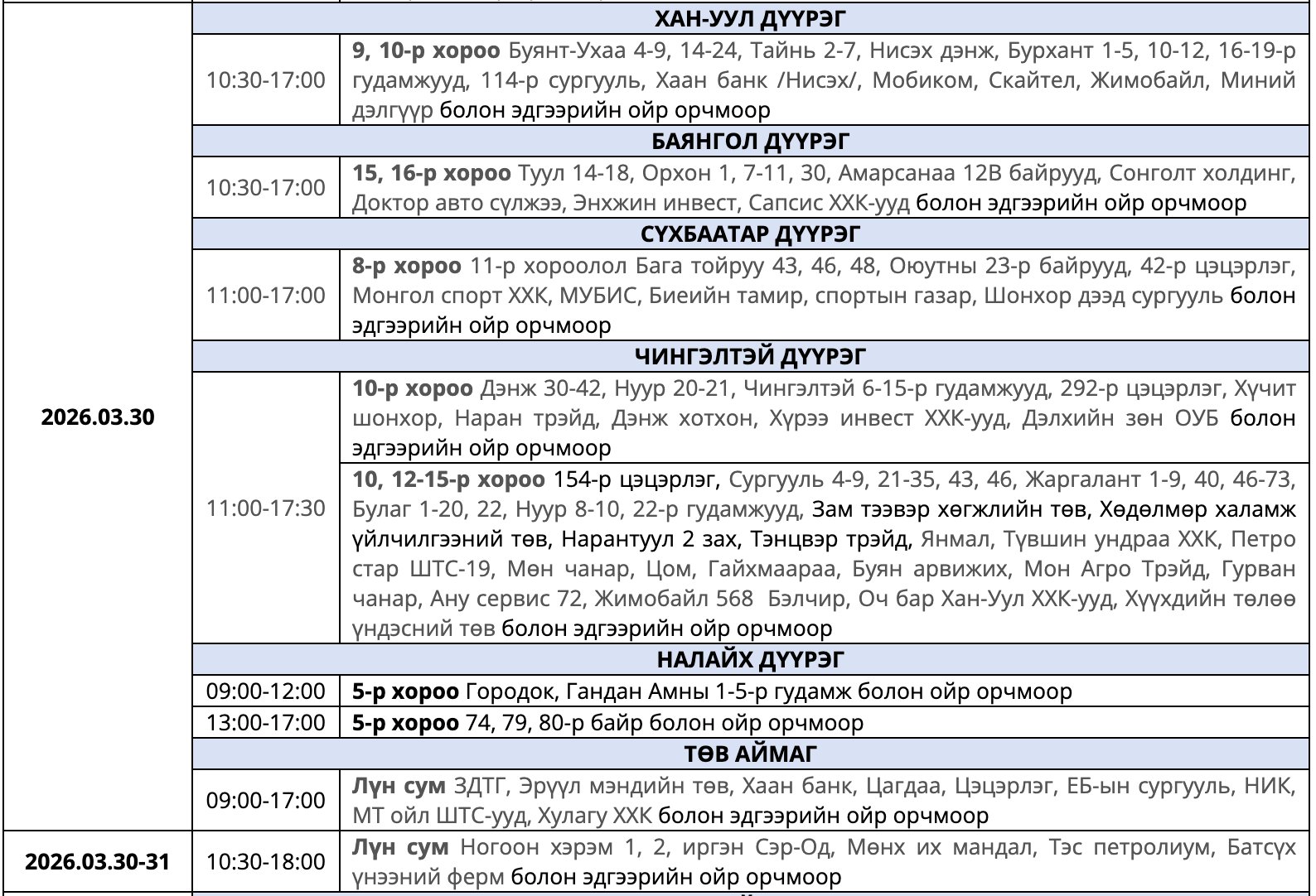 Улаанбаатар Цахилгаан Түгээх Сүлжээ(УБЦТС) ТӨХК 2026 оны гуравдугаар сард цахилгаан шугам тоноглолд засвар хийх тоймчилсон байршил, цагийн хуваарийг мэдээллээ.