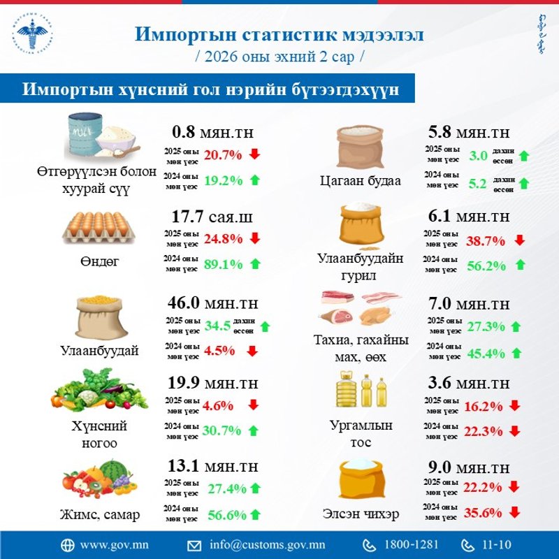 Хүнсний гол нэрийн бүтээгдэхүүн дунд цагаан будааны импорт хамгийн их буюу өмнөх оны мөн үеэс гурав дахин нэмэгджээ. Түүнчлэн тахиа, гахайн мах өөх, жимс самрын импорт 27 хувиар өсөв.