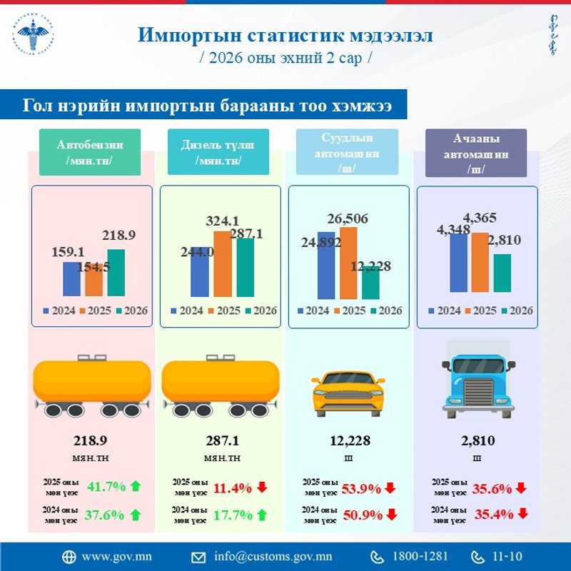Монгол Улс 2026 оны эхний хоёр сард нийт 1.6 тэрбум ам.долларын бараа импортоор авчээ.