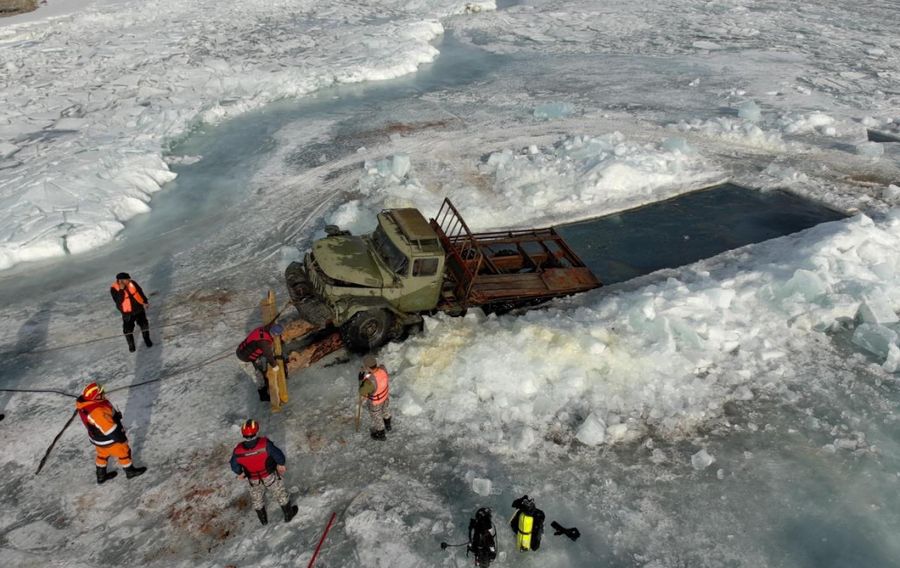 Тус автомашин нь 23 метрийн гүнд живсэн байсан бөгөөд 10м урттай, 3.5м өргөнтэй мөс гудамлаж, эргээс 90 метрийн зайнаас татан гаргасан байна.