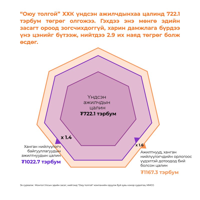 Нийт дүнгээрээ "Оюу толгой" компанийн үндсэн болон ханган нийлүүлэгчдийн цалин нэг жилд 1.7 их наяд төгрөг давж байгаа бөгөөд энэ их мөнгө дотоодын эдийн засагт янз бүрийн худалдан авалтаар дамжин давлагаалж, нэмэлтээр дахин нэг их наяд гаруй төгрөгийн цалинг бусад салбарынхан авах боломжийг үүсгэдэг байна. Ингэснээр Оюу толгойн үйлдвэрлэлийн шууд, дам, өдөөгдсөн нөлөөгөөр нийт 2.9 их наяд төгрөгийн цалингийн орлого бий болж байгаа нь Монгол Улсын нийт цалингийн орлогын 12.6 хувийг эзэлж байна.