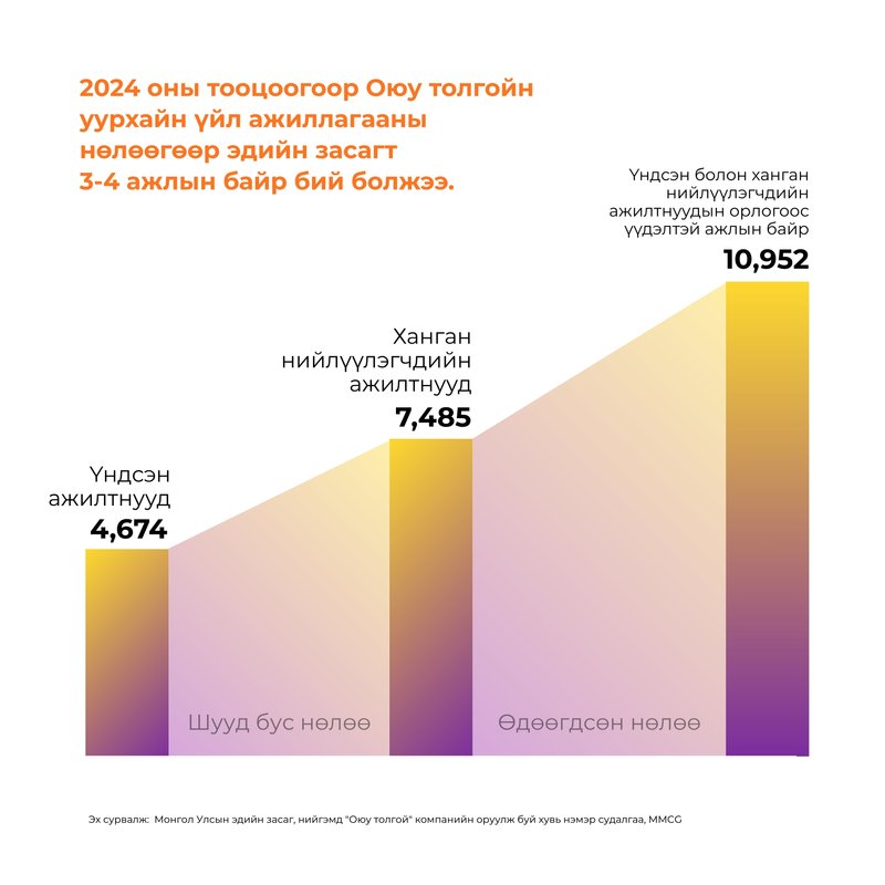 MMCG компанийн “Оюу толгой”--н Монгол Улсын эдийн засаг дахь нөлөөг хэмжсэн судалгаанаас үзэхэд үйлдвэрийн нэг ажилтан тутмын авч буй сарын цалингийн нөлөөгөөр Өмнөговь, Улаанбаатар болон бусад аймагт 1-2 ажлын байр уул уурхайн бус салбарт нэмэгдэж байдаг байна. Харин нийт “Оюу толгой” компанийн үйл ажиллагааны үржигдэх нөлөөгөөр харвал, 3- 4 ажлын байр эдийн засагт шинээр бий болсноор нийт 23,110 ажлын байр Монгол Улсад идэвхэжжээ.