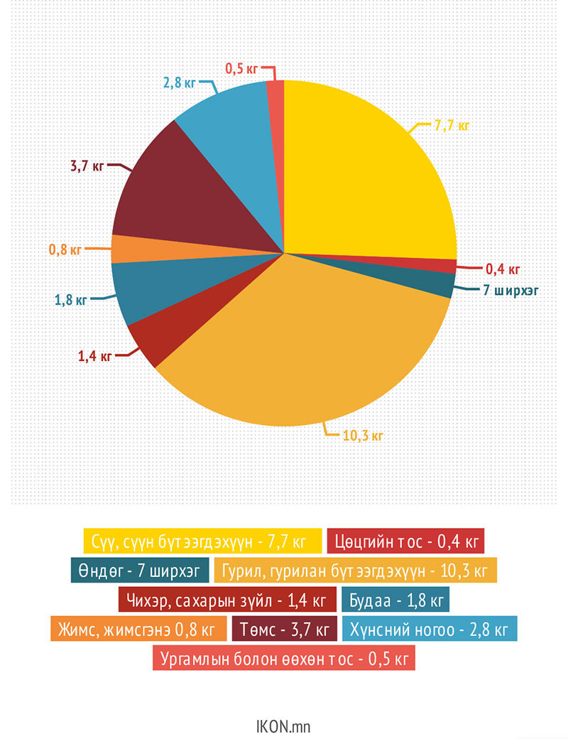 Мөн долоон ширхэг өндөг, 1,4 кг чихэр, сахарын зүйл, 1,8 кг будаа, 3,7кг төмс, 2,8кг хүнсний ногоо сард хэрэглэдэг байна.
