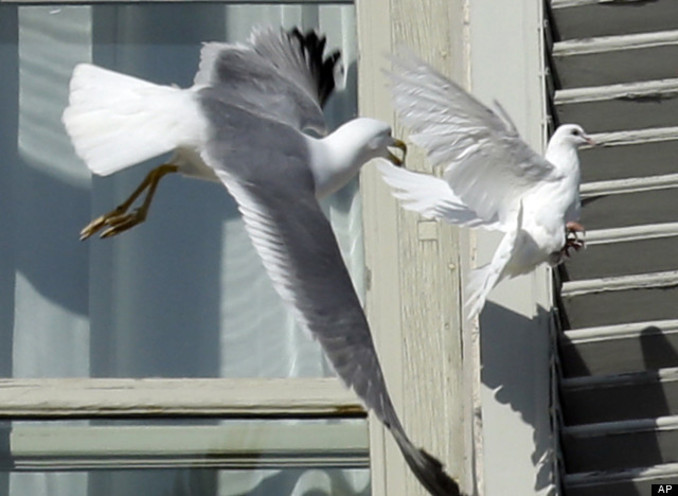 Гэвч цагаан тагтаануудыг цонхоор дөнгөж нисгэмэгц цахлай, хэрээ дайрсан байна. Цахлай нэг тагтааны сүүлнээс нь зуурсан бол, нөгөө тагтааг нь хэрээ савардаж хэдэнтээ тоншжээ. Удалгүй Ватиканы талбайгаас хоёр тагтаа нисч одсон ч тэд талбайгаас нисч гарсны дараа хэрхсэн нь тодорхойгүй байна.