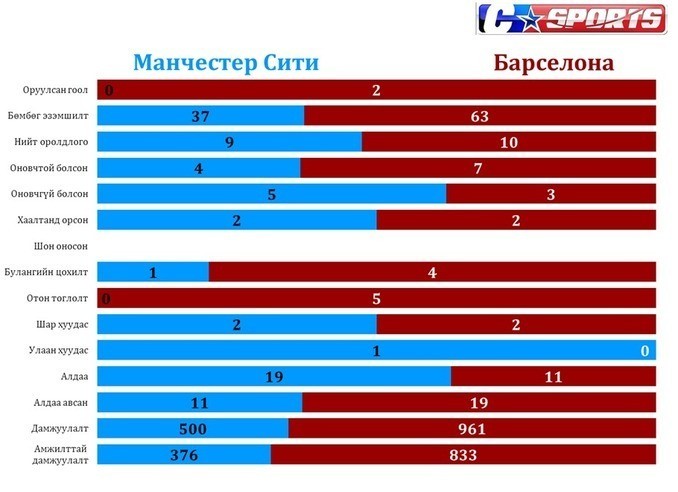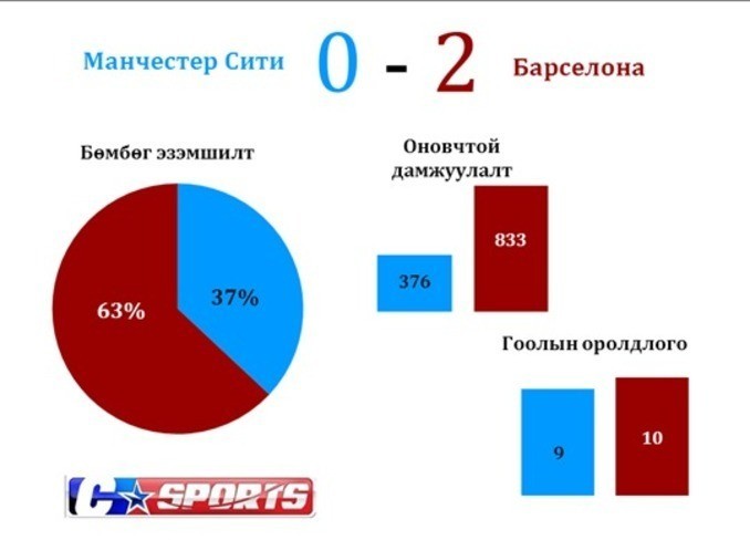 Барселона клуб Л.Месси болон Д.Альвеш нарын оруулсан гоолын дараагаар хүчтэй өрсөлдөгч Манчестер Ситиг талбайд нь 2:0-ээр буулгаж аван, дараагийн шатанд шалгарах маш давуу талыг бүрдүүлж чадлаа.
