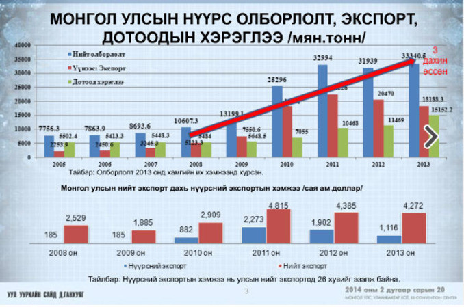 Экспортын хэмжээ буурсан ч гэсэн манай улсын нүүрс олборлолт 2008 онтой харьцуулахад гурав дахин өсчээ.