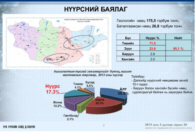 Монголчуудын хар алт хэмээн нэрлэдэг нүүрсийн геологийн нөөц 175.5 тэрбум тонн, баталгаажсан нөөц 26.8 хувь байна. Энэ нь манай улс нүүрсний нөөцөөрөө дэлхийд эхний 10 дугаар байрт жагсах үзүүлэлт болсон юм. Харин Баруун болон Хангайн бүсийн нүүрсний нөөц судлагдаагүй байгаа.
