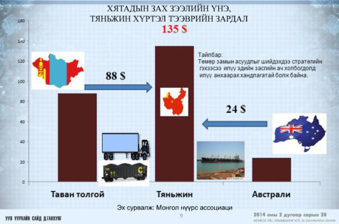 Өмнөд хөршид нийлүүлж буй нүүрсний хэмжээгээрээ 2013 оны байдлаар 2-т орж байгаа. Гэвч бусад орнуудаас дунджаар 2 дахин бага үнээр нийлүүлж байна. 2013 оны байдлаар коксжих нүүрсний үнийг дунджаар 73 ам.доллараар экспортолж байна.