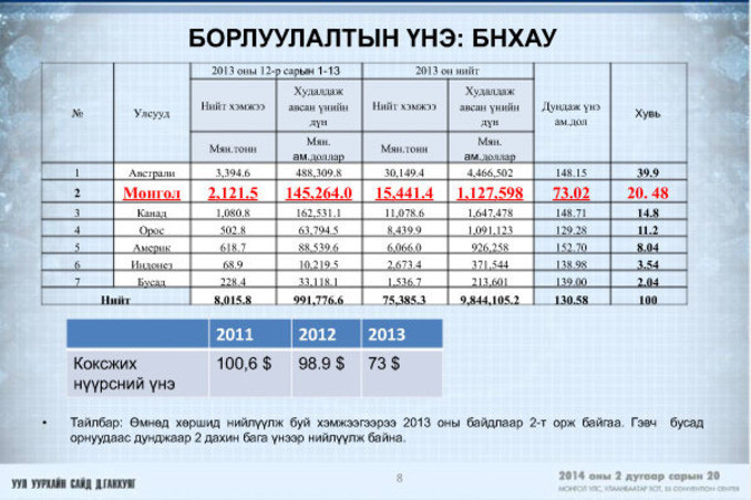 Монгол улсын нийт нүүрсний экспортын хэмжээ 2012 онд 1,902 сая ам.доллар хүрч байсан бол 2013 онд 1,116 сая ам. доллар буюу 40 орчим хувиар буурчээ.