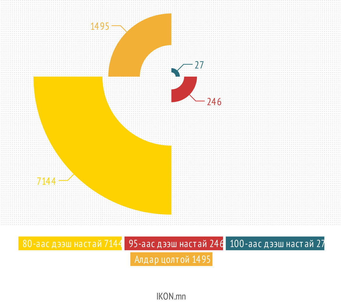 Нийслэлийн хэмжээнд өнөөдрийн байдлаар 62146 өндөр настан халамж үйлчилгээнд хамрагддаг. Тодруулбал, 80-аас дээш настай 7144, 95-аас дээш настай 246, 100-аас дээш настай 27, алдар цолтой 1495 азай буурал Улаанбаатарт амьдардаг байна.