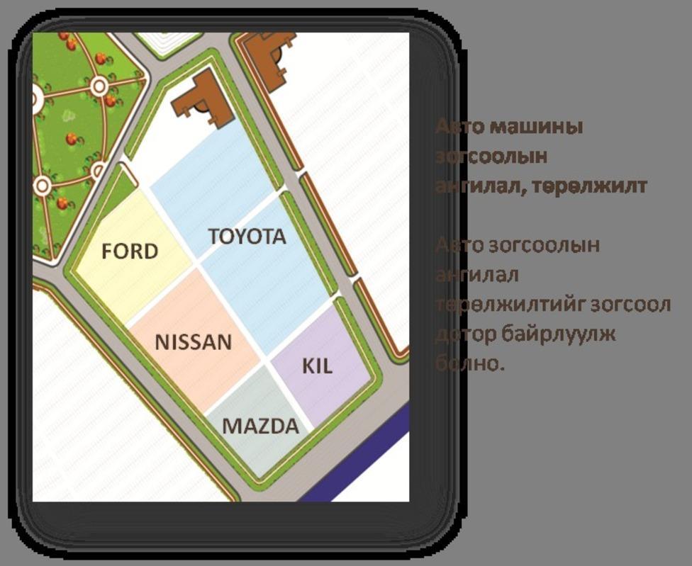 - Авто зогсоолуудыг Toyotа, Ford, Nissan зэргээр нь ангилан байрлуулна.