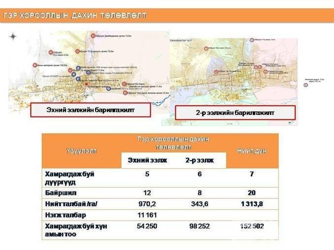 2. Гэр хорооллын дахин төлөвлөлтийг хувийн хэвшлийнхэнтэй хамтарч хийх бөгөөд эхний ээлжинд таван дүүргийн 12 байршилд нийт 970 га талбайд төлөвлөлт хийнэ.