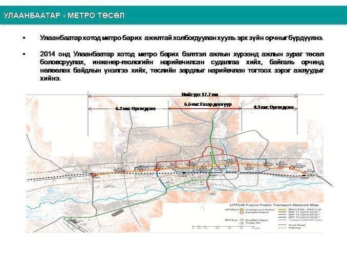 7. Улаанбаатар хотыг 2030 он хүртэл хөгжүүлэх Ерөнхий төлөвлөгөөнд 2020 он гэхэд нийслэл метротой болох хөтөлбөр багтсан. Ажлын зургууд хийгдэж байгаа, барилгын ажил 2016 онд эхэлнэ.