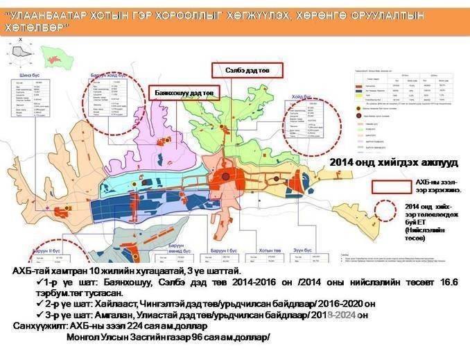 1. “Улаанбаатар хотын гэр хорооллыг хөгжүүлэх, хөрөнгө оруулалтын хөтөлбөр”-ийг энэ онд эхэлнэ. Азийн хөгжлийн банктай хамтран 10 жилийн хугацаатай гурван үе шаттай хэрэгжих энэ хөтөлбөрийн эхний шатанд Баянхошуу, Сэлбэ дэд төвүүдийг бий болгох ажлыг эхлүүлнэ, нийслэлийн төсөвт 16,6 тэрбум төгрөг тусгажээ.