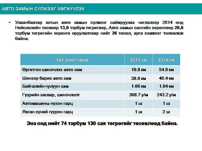 6. Улаанбаатар хотын автозамын сүлжээг сайжруулах чиглэлээр энэ онд 36 төсөл арга хэмжээг хэрэгжүүлнэ. Өнгөрсөн онд 20 орчим км замын өргөтгөл шинэлэлтийн ажил хийгдсэн бол энэ онд 55 орчим км замын өргөтгөлийн ажил өрнөнө. Шинээр 44 гаруй км зам баригдана. Байгалийн чулуун зам, гүүрийн засвар шинэчлэлт, автомашины нүхэн гарц, явган хүний гүүрэн гарцын ажил хийгдэнэ. Эдгээрт нийт 74 тэрбум төгрөг төсөвлөжээ.
