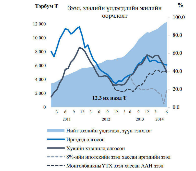 Харин 8%-ийн ипотекийн зээлийг хасч тооцвол, иргэдийн зээлийн жилийн өсөлт 2014 оны 6 дугаар сарын байдлаар 19.4 хувь, Монголбанкны үнэ тогтворжуулах хөтөлбөрийн зээлийг хасч тооцвол хувийн хэвшлийн зээлийн жилийн өсөлт 38.8 хувьтай байхаар байжээ.