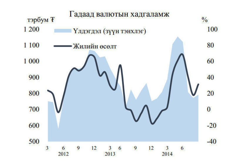 Гадаад валютын хадгаламж өмнөх сараас 3.0 хувь буюу 42.6 тэрбум төгрөг, өнгөрсөн оны мөн үеэс 31.5 хувь буюу 346.6 тэрбум төгрөгөөр өсч 1447.3 тэрбум төгрөг болжээ.