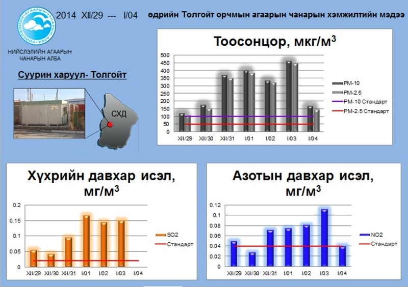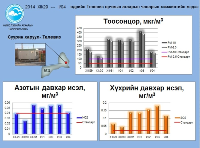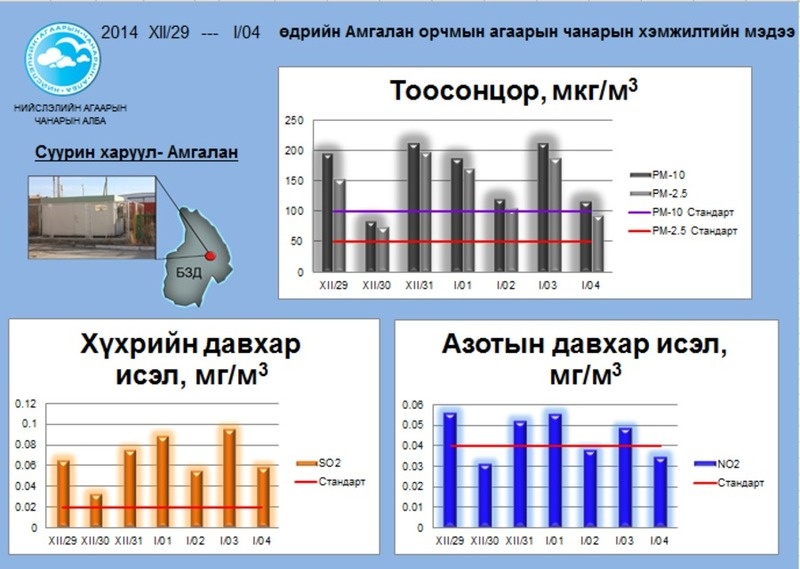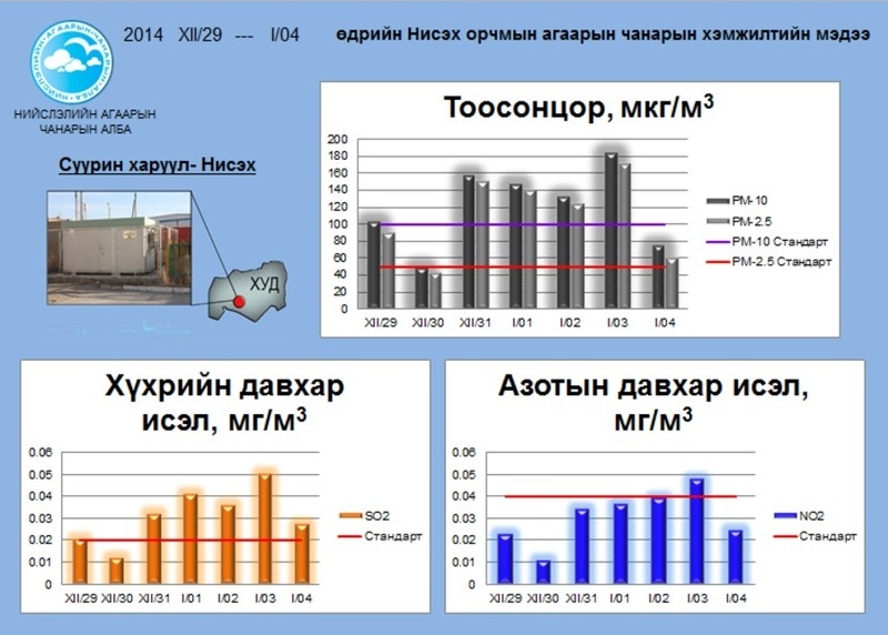Нийслэлийн Агаарын чанарын албаны мэдээллээр арванхоёрдугаар сарын 29-нөөс нэгдүгээр сарын 04-ний өдрийн байдлаар Нисэх, Толгойт, Телевиз, Амгалан орчимд тоосонцор, азотын давхар исэл, хүхрийн давхар ислийн хэмжээ ямар байгааг зурган хүснэгтээр танилцуулж байна.