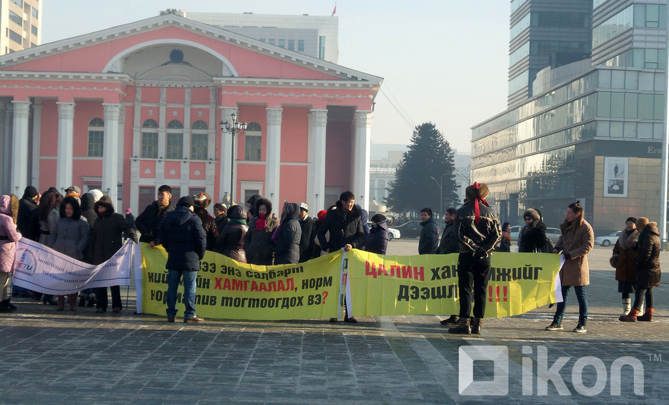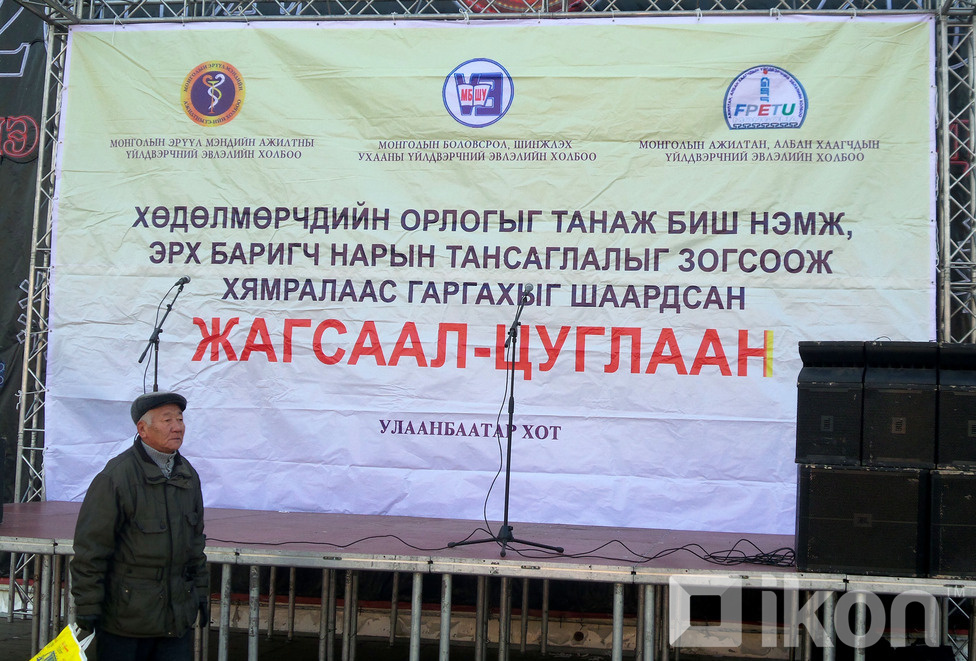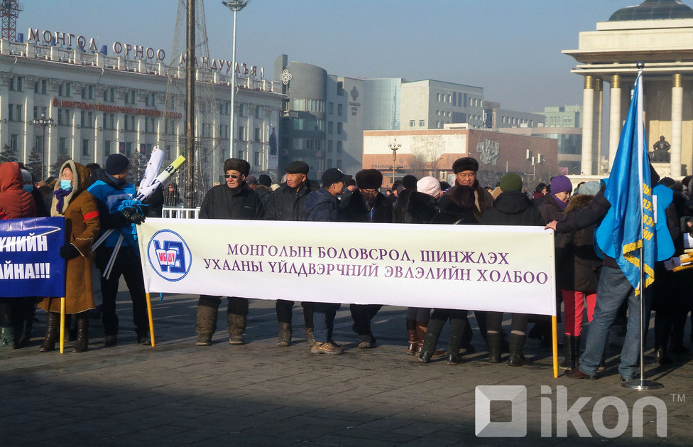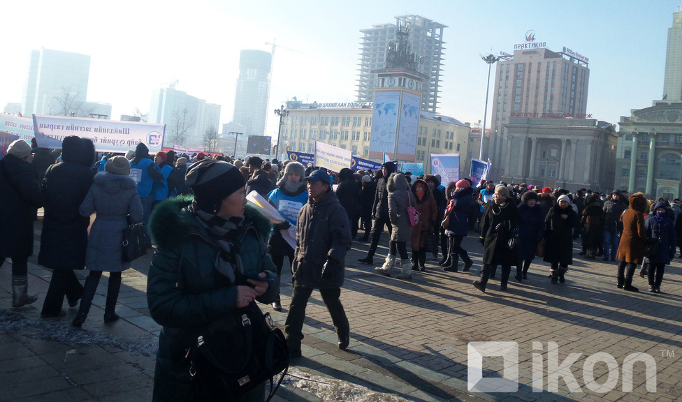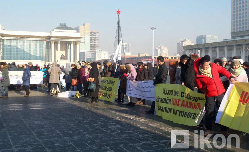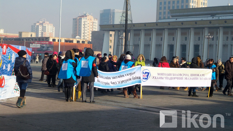 Ч.Сайханбилэгийн Засгийн газрын уг шийдвэрийг эсэргүүцэж буй боловсрол, эрүүл мэнд , соёл урлагийн салбарт ажиллагсад Чингисийн талбайд жагсаж байна.