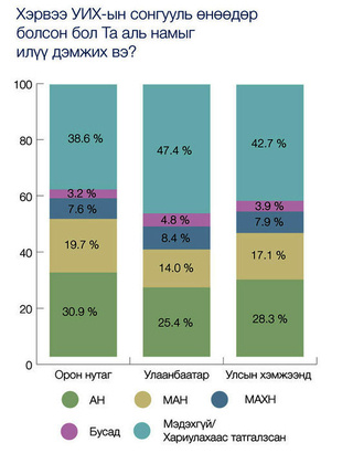 Үлдсэн 28,3 нь АН, 17,1 нь МАН, 7,9 хувь нь МАХН гэсэн бол 3,9 хувь нь бусад намуудыг сонгожээ.
